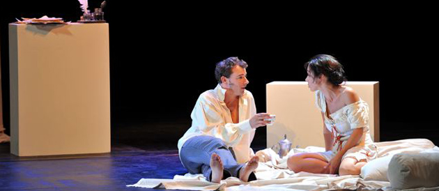 La mise en scène proposée par Thierry Lavat sert avec délicatesse l’interprétation des deux comédiens. Tout y est « grâce » ; le choix de la méridienne, les costumes et les ombres chinoises, permettant ainsi à Miren Pradier et Christophe de Mareuil de s’évader dans un environnement aussi enchanteur que leur jeu d’acteur. Elle, virevolte avec passion. Et lui, désarme par sa nonchalance.