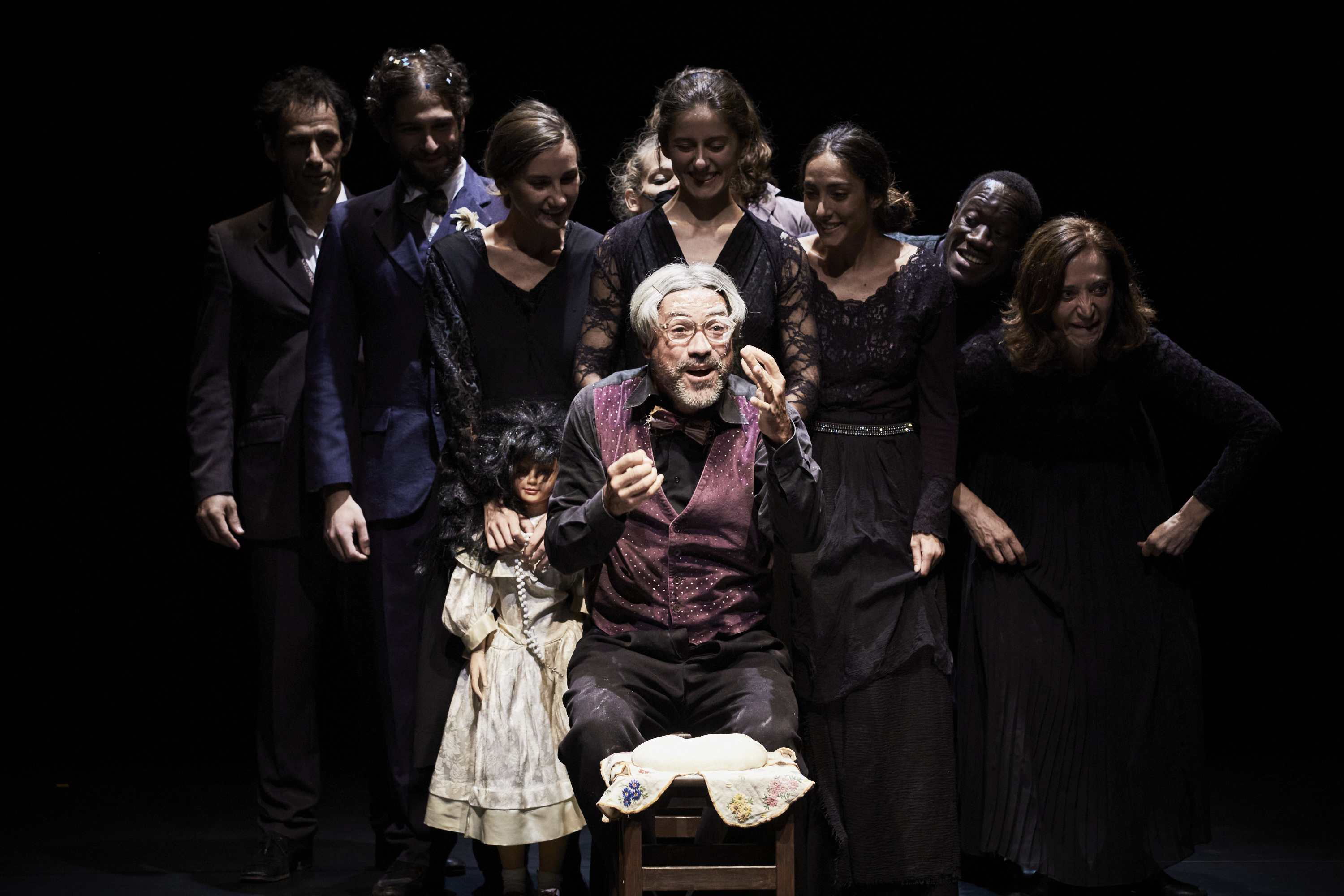 Un vieil homme solitaire à la veille de la fête des morts prépare une poupée de sucre pour évoquer le souvenir de ses proches. Tandis que la pâte lève, les souvenirs affluent, réveillent les défunts. Et ils sont tous là, ses morts, plus vivants sans doute que jamais. Ses trois sœurs, si belles, inséparables jusque dans leur mort, la mère qui chaque jour attendait sur le port son mari disparu en mer, le père pour toujours éclatant de jeunesse, le frère adopté venu d’Afrique, l’oncle qui battait tant sa femme et qui disait l’aimer, et la tante qui tant était battue et disait être aimée… Dans cette chambre, la vie fait irruption avec fracas, joyeuse et bouleversante, scènes d’un quotidien pendulant entre comédie et tragédie. C’est un formidable souffle vital, qui traverse ce plateau, cette chambre devenue lieu de mémoire ardente où la présence des morts effacent pour un temps la solitude de ce vieillard. Oui, ils sont plus vivants que jamais ces morts qui loin d’être de pâles fantômes sont incarnés bellement, présences bien réelles et si magnifiquement charnelles… interprétés par une troupe de comédiens cosmopolites, qui a son importance ici, dirigés au cordeau, éclatant de talent et de générosité, offrant à leur personnage une part d’humanité inouïe et déchirante.