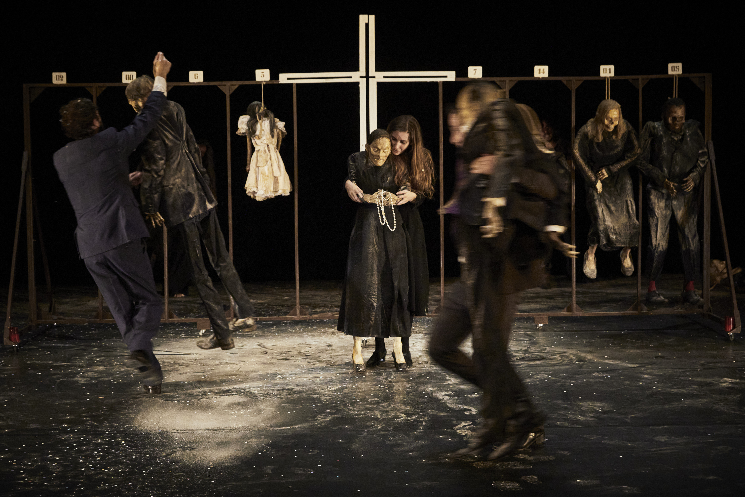 Emma Dante célèbre ainsi la mort dans ce qu’elle a de plus intime et de plus universel, dans ce lien ténu et irréfragable qu’elle entretient avec la vie, qu’elle répare et cautérise, où les morts sont encore vivants pour peu qu’on les convoque et vous accompagnent pour ne pas mourir tout à fait, et que nous aussi nous ne mourrions pas tout à fait. Et la fin, si surprenante, inattendue, renversement brutal d’une poésie noire et baroque qui, loin d’être macabre, affirme simplement l’obsession de la vie par-delà la mort, cette volonté tenace et têtue de résister à l’inéluctable, et vous foudroie brutalement et touche profondément par sa radicalité volontaire et sa vérité rêche. C’est tout soudain un opera dei pupi funèbre figé pour toute éternité, qui succédant au maelstrom vibrionnant qui précède, ancre ses corps soudain inertes et sans vie, vidés de leur substance, dans un présent perpétuel, reflet définitif et friable de ce qu’ils furent au plus profond d’eux-mêmes.