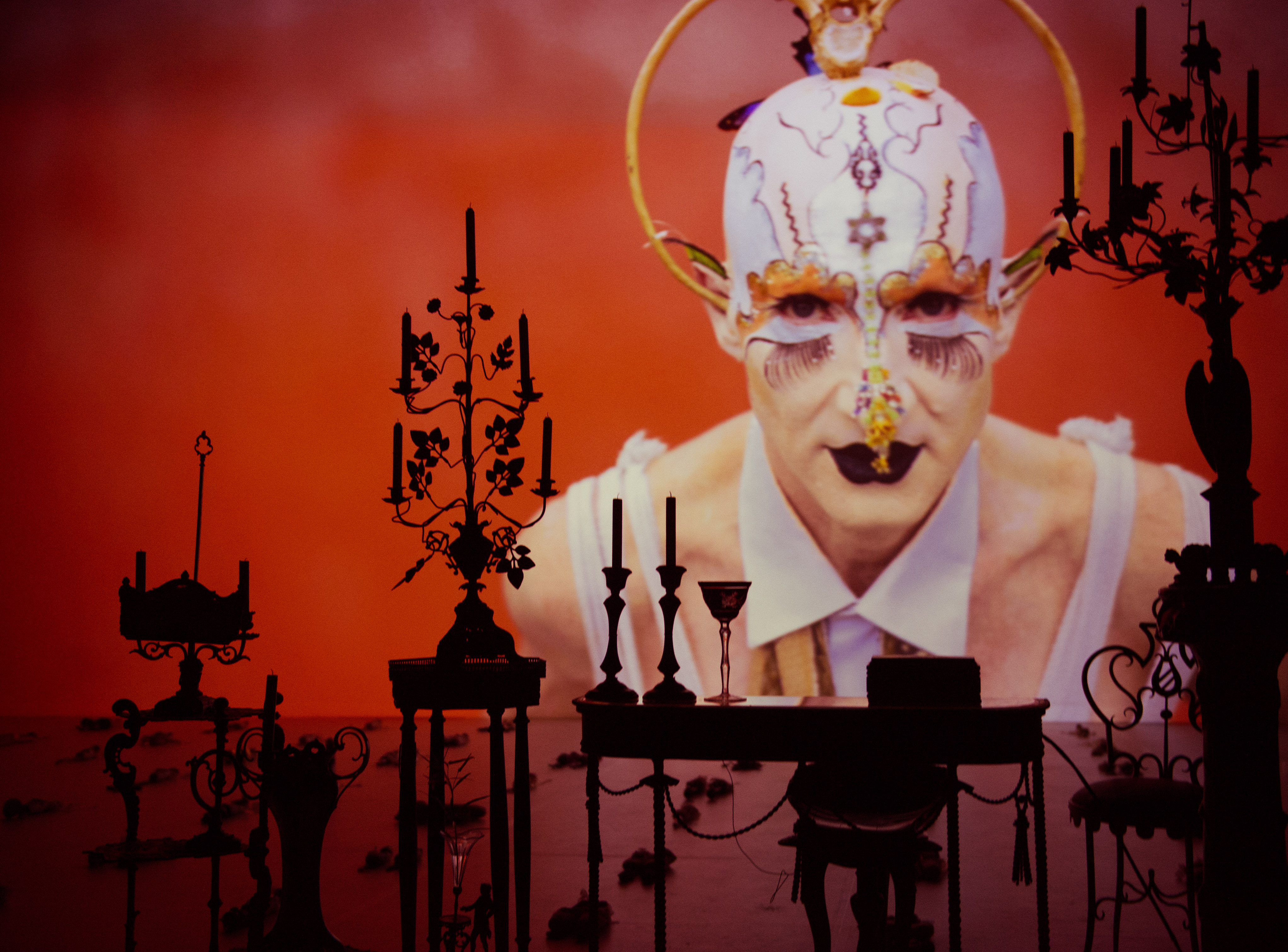 Elu au centre de cette nouvelle performance, protocole d’adieu et cérémonie funèbre, cénotaphe pour l’être aimé et disparu en 2016. Steven Cohen, inconsolable, invente un rituel baroque, à son image, entre douceur et violence, sidérant de beauté. Cercueils aux pieds pour hautes et vertigineuses cothurnes, il s’avance, gracile, la marche ainsi entravée, contrainte, au bord de toujours tomber. Déambulation fragile, dans un champ de reliques précieuses, les chaussons de danse d’Elu métamorphosés en étranges objets d’art, hybridés comme autant de chimères, exposés là, sur le plateau. Ne pas tomber, continuer à avancer, parce qu’il le faut, au risque de trébucher, malgré le poids et l’insoutenable du deuil. « Put your heart under your feat… and walk ». Injonction consolatrice de sa nourrice et mère adoptive, Nomsa Dhlamini, elle aussi disparue, cette phrase désormais tatouée au pied, Steven Cohen l’inconsolé marche, avance malgré la douleur chevillée.