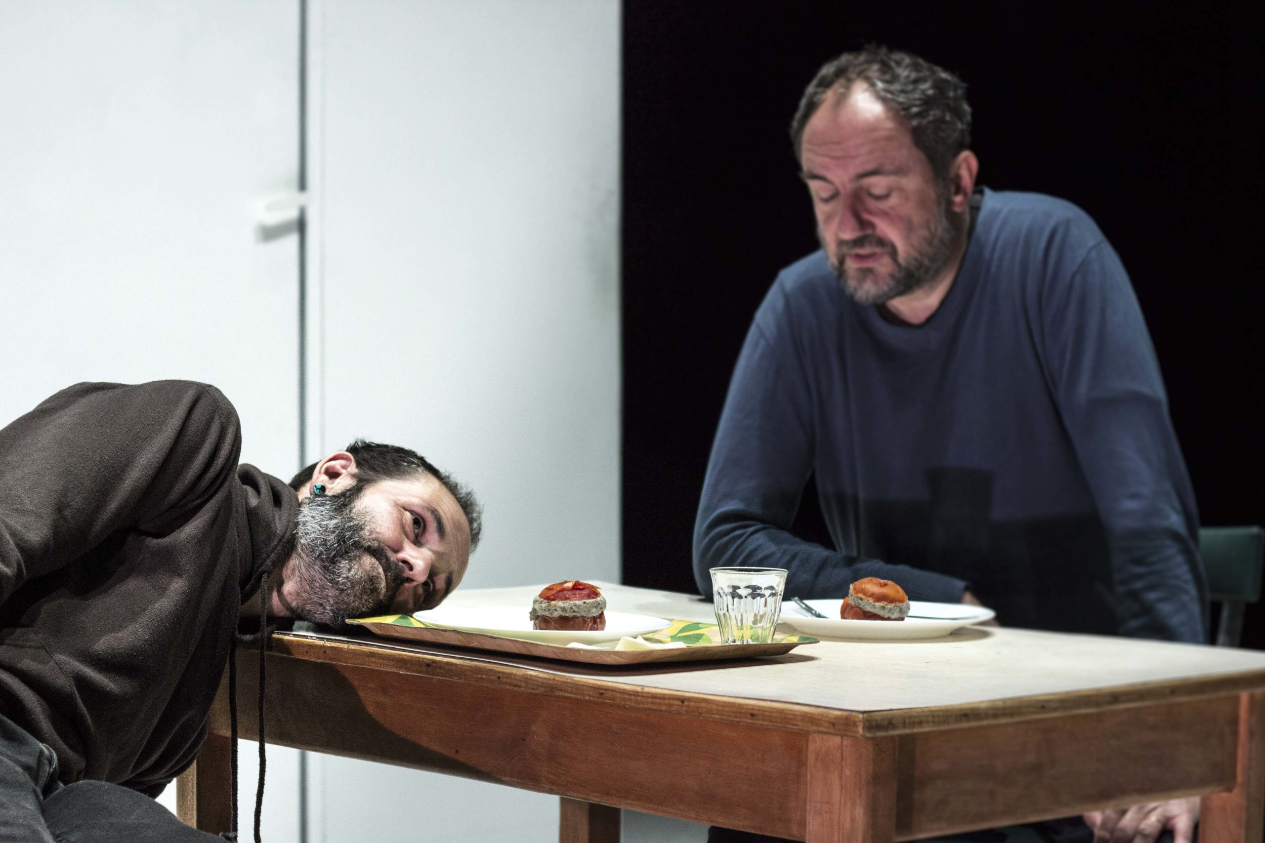 Le texte ardu s’enroule autour d’images crues, mystérieuses, de listes, stichomythies, méandres avec des voix, des silhouettes. On pense à William Burroughs qui déconstruisait le langage pour épouser la perception d’un individu plongé dans un environnement dont il ne partageait ni les stimuli, ni les codes. La puissance de ce spectacle tient à l’interprétation de Julien Defaye, un physique à la Daniel Darc, chanteur du groupe Taxi Girl et héroïnomane décédé prématurément. Sa voix épouse les dérèglements, les syncopes, les ruptures, la musique d’une traversée des Bermudes chaotique. Il est accompagné de Vincent Leenhard, éducateur à la présence cadrante qui tient bon sur le « trottoir d’en face ». On retiendra particulièrement la fable de l’homme au bord d’une rivière, toujours sur la rive pluvieuse, qui n’arrive jamais sur « le bon bord » la berge ensoleillée. Il finira par boire toute la rivière, son corps deviendra rivière. Certains moments sont franchement drôles, notamment la scène de la cigarette qui voit le résident exiger de l’éducateur une demande écrite dûment rédigée et motivée pour lui offrir une cigarette, tournant en dérision le formalisme du traitement administratif des toxicomanes.