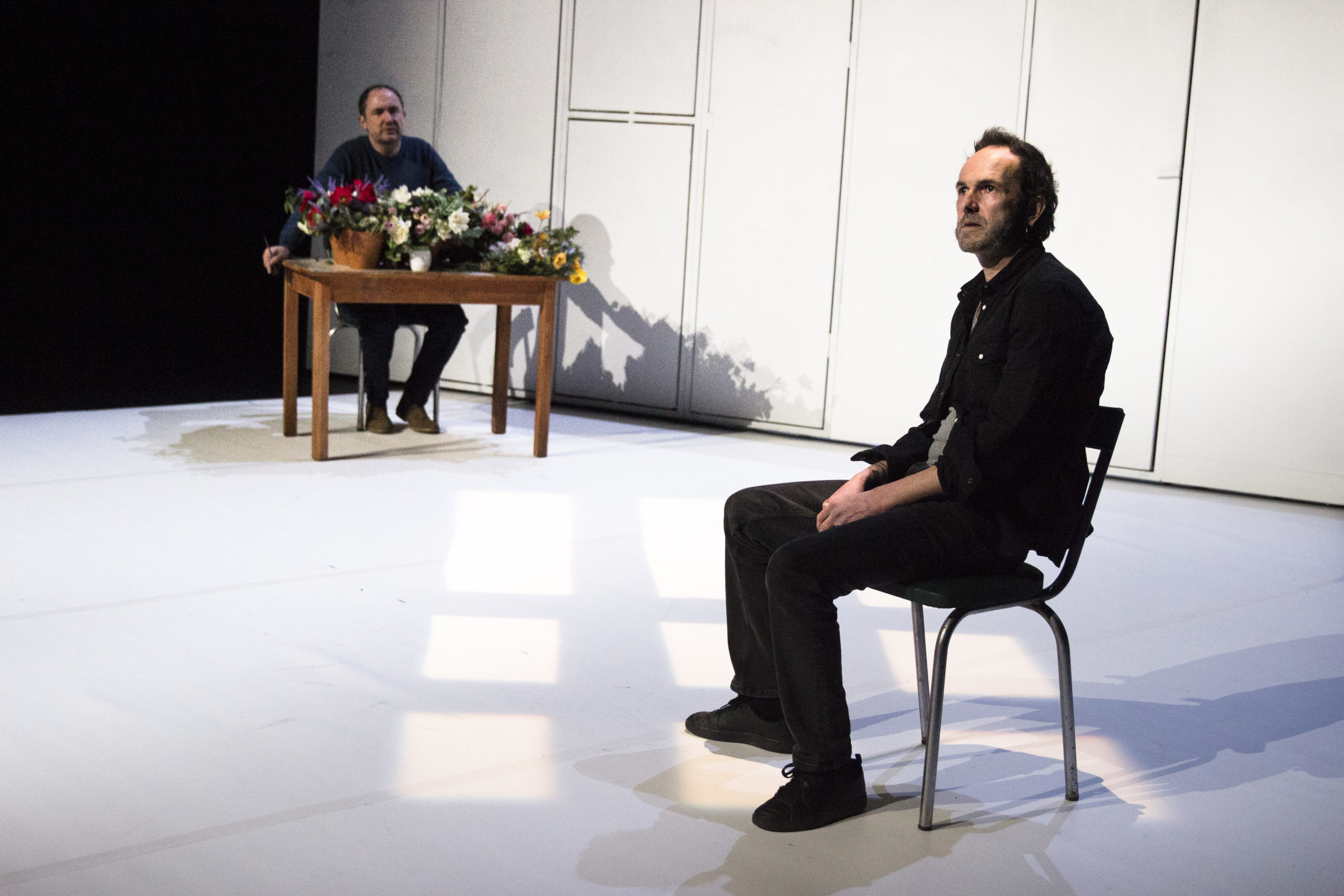 La mise en scène de Catherine Vasseur épouse les fluctuations psychiques du résident avec un panneau blanc amovible qui ouvre ou resserre l’espace. Les objets sont là pour nous rappeler le temps qui passe, la cafetière électrique et le café. La table, l’assiette, le pot de fleurs, le cep, le stylo, le bloc de papier, la cigarette, les fleurs répandues au sol témoignent de la relation entre le thérapeute et son patient lors des rituels quotidiens, la distribution du courrier, les repas, les entretiens, les promenades.