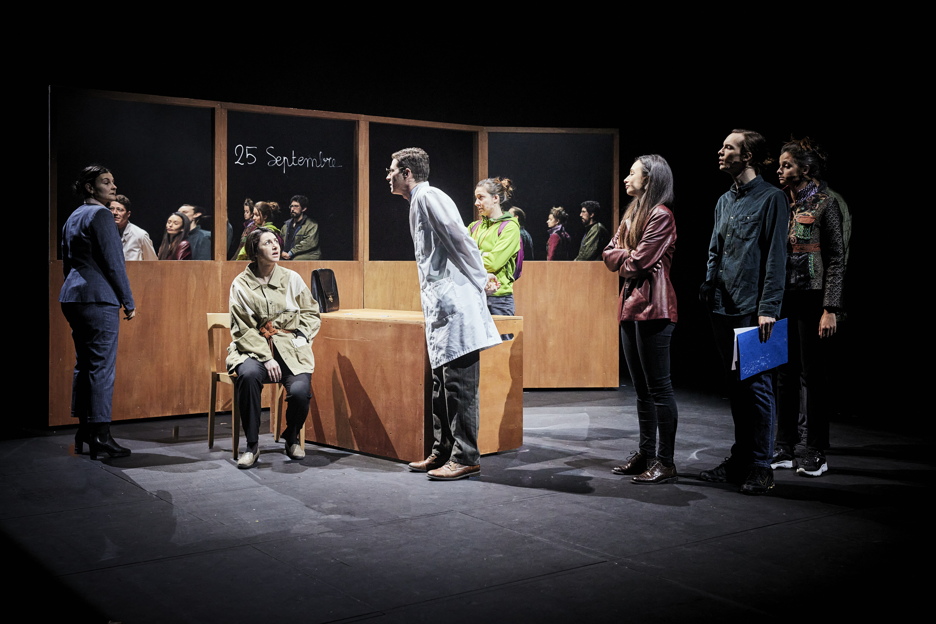 La scénographie de ce spectacle est excellente, dynamique et efficace sur cette scène nue. Tous et toutes bougent des « presques » meubles et l’on se retrouve dans une salle de classe, dans la cour, dans un bureau, etc. On est presque dans un ballet ici ou là, les corps remuent avec la même souplesse. Beaucoup de bonnes choses donc, mais avions-nous besoin de suivre toute l’année scolaire ? Heureusement que les heures de colle n’ont pas été mises en scène. Pourquoi ? Parce que le rythme était aussi surélevé que les hurlements permanents. Oui, nous n’allions pas écouter La Traviata, mais là, le trouble des répétitions, des allongements, est du « trop », en vrai. Un peu plus de « vrai » texte, ou bien présenté autrement qu’à travers cris et sifflets ? Du plus lent dans cette structure de cris, de colère, de peur et de lassitude eût été nécessaire. Vraiment. Ou alors vingt minutes de moins et alléluia. Dommage parce que le sujet est excellent, le jeu de même, à part peut-être ici ou là des faiblesses, commes des lumières ultra clignotantes répétées et épuisantes. Ce n’est pas à conseiller à des profs, c’est évident… Des détails de forme donc, mais le résultat reste ou devient un coup de poing qui vaut grandement le détour.