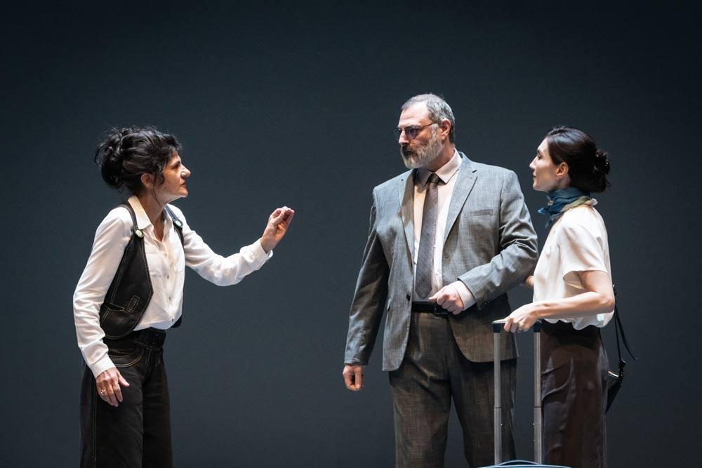 Racine carrée du verbe être est une sorte d’uchronie composée de trois parties, inégales en termes de durées et de contenus. L’épopée de 6 h 30 (5 h environ si l’on retranche les entractes) part de l’explosion au port de Beyrouth d’août 2020 et qui une fois les thèses complotistes essoufflées a mis en lumière encore plus que la/les guerre(s) l’incurie, la vénalité, la corruption des dirigeants. L’explosion, comme nouvel élément déclencheur d’un exil massif, revient comme un leitmotiv lors des différents passages d’ « Actes » de la pièce, au moyen du travail vidéo réussi de Stéphane Pougnand (des cartoons qui tournent mal et surtout la vidéo initiale de l’explosion qui se transforme en un vol au ralenti continu et stylisé des débris durant toute la première partie.)