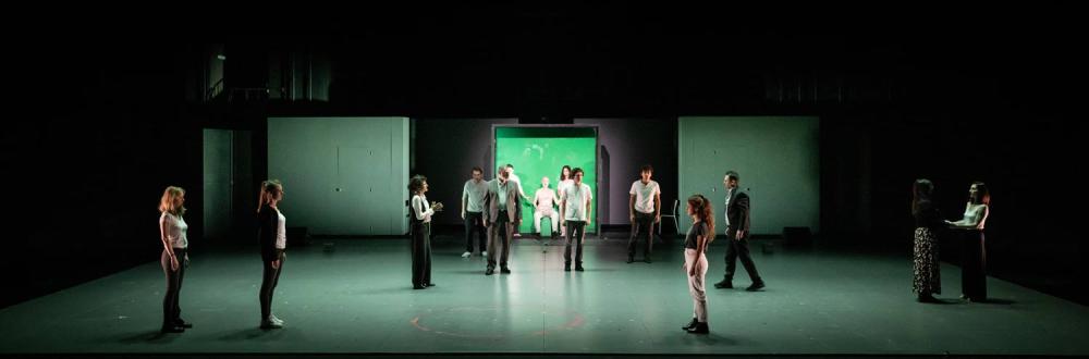 Le début de la troisième partie après le second entracte atteint un point paroxystique, qui est celui de la rencontre entre les différents destins individuels possibles conduisant les comédiens et en particulier Norah Krief jouant Layla, la sœur, à s’adresser à trois Talyani en même temps. Une performance. C’eut été le bon moment pour s’arrêter là, avec un retour au dialogue introspectif entre le Talyani enfant et le Talyani vieillard du début brandissant la « couleur verte » (celle des cèdres ?) face à une question insoluble. Mais malheureusement avant de fermer ainsi la boucle, on passe par un monologue beaucoup trop long de Wyo (néanmoins parfait Jérémie Galiana) et une leçon elle aussi trop étendue de mathématiques par Hanane (sensible Julie Julien déjà présente dans Littoral), avant que Wajdi Mouawad serrant contre lui son enfant intérieur, nous fasse la morale de l’histoire. Même si cela fait incontestablement redescendre le soufflet en perdant la dimension quasi fantastique des quatre premières heures, Racine carrée du verbe être fait se lever entièrement la salle au bout de l’intégrale (on peut aussi voir le spectacle en deux parties séparées). C’est plus que mérité tant la distribution dans son intégralité (y compris la Jeune troupe) est irréprochable, la mise en scène brillante et les questions posées essentielles.
