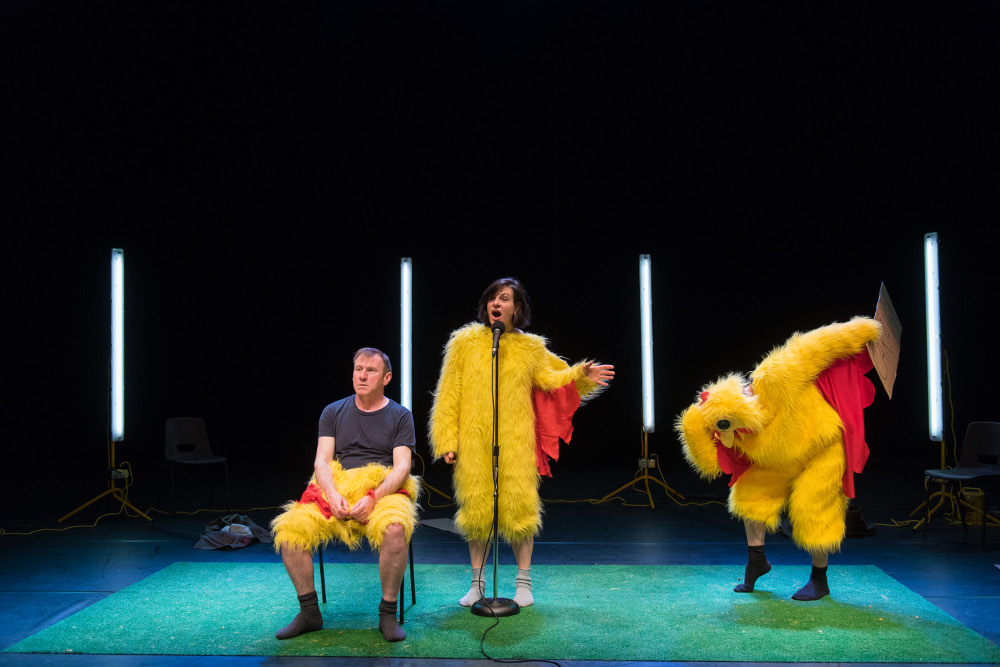 Deux candidats pour un jeu absurde orchestré par un animateur bateleur retors. Deviner pour l’un un mot parmi tous ceux de la langue anglaise choisi par son adversaire. Improbable, voire impossible. Il n’y a rien à gagner, rien, sinon à recommencer. Encore et encore. Après trois échecs prévisibles, malgré le suspense orchestré, et la sortie du vaincu, le jeu ne s’arrête pas. Vite, vite, les trois échangent leurs rôles, leurs costumes, et rejouent la même scène, à l’identique ou presque. La séquence se répète ad libitum, ad nauseam. Variation sur un même thème, usé jusqu’à épuisement des interprètes. Tout se déglingue, tout se délite et s’effondre malgré les vains et rares efforts pour sortir de cet enfer. Et tout recommence. Jusqu’à oser, et en pure perte, la triche. Il ne manque rien à ce jeu rapidement infernal, ni les rires et les applaudissements enregistrés, bientôt crispant, effrayant même, ponctuant l’inéluctable et pathétique déréliction des candidats habillés piteusement en poussin jaune criard. Pas même l’humiliation d’une danse croupion imitant la poule…