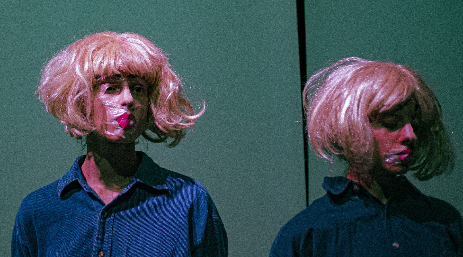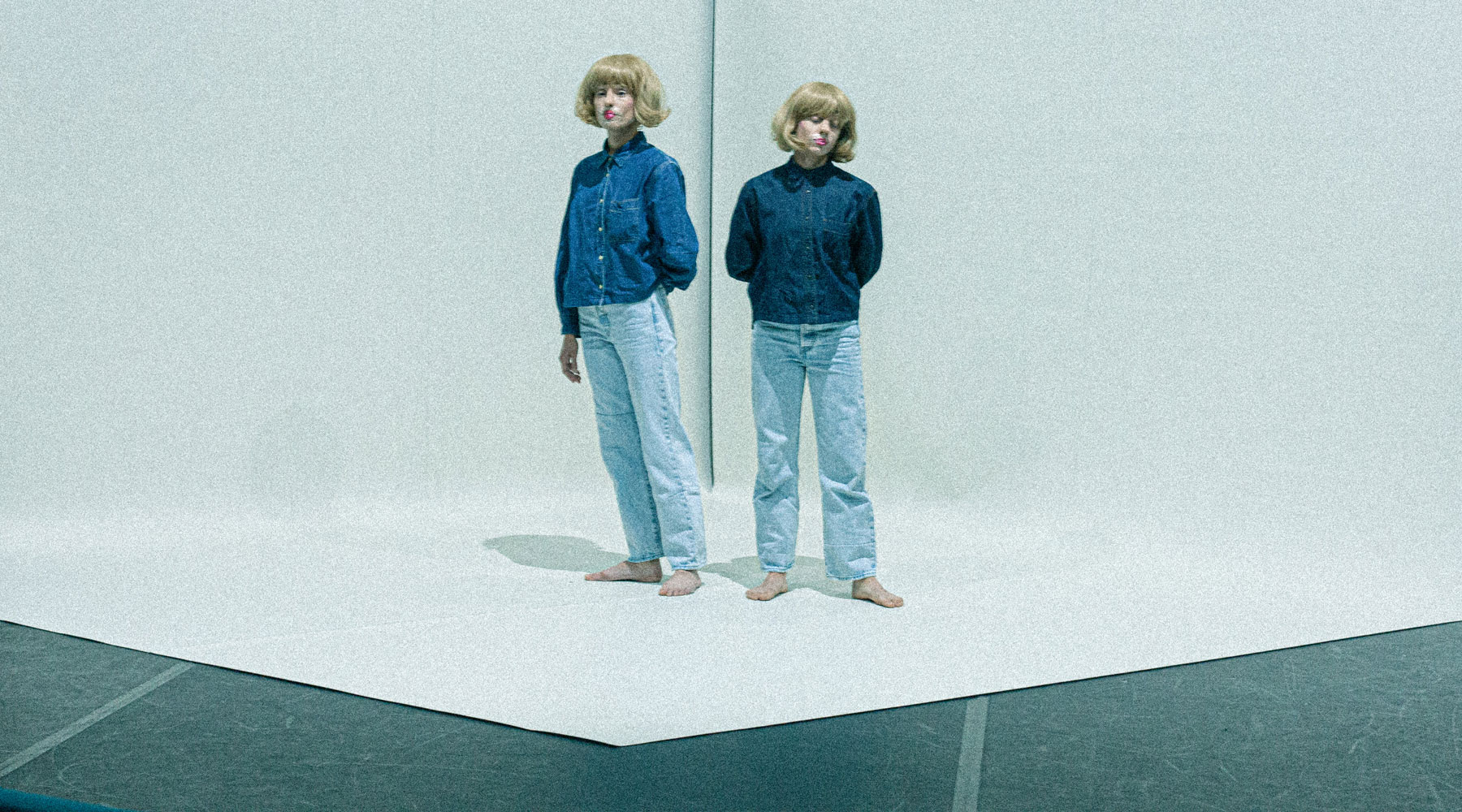 Elles sont deux. Comme l’ombre déportée de l’une ou le reflet inversé de l’autre. Elles se ressemblent, même perruque blonde, même tenue vestimentaire faite de jeans, mais se distinguent. Elles forment un angle, comme un V, par leur contrapposto opposé. Elles sont déjà là quand nous arrivons, immobiles sur un sol et fond blancs, comme deux mannequins de plastique, comme deux mannequins de chair à détourer dans une séance de shooting photographique, et elles sont tout autant absentes, nous faisant signe d’un ailleurs, leur représentation visible n’étant qu’un passe-muraille pour toucher du doigt l’infigurable. REFACE du Collectif Les Idoles est sidérant dans sa performance, profondément troublant par ce qu’il agite et parce qu’il agit dans nos systèmes cognitifs. Et si la référence à l’artiste Cindy Sherman et à ses travaux photographiques saute immédiatement aux yeux dans ce paradoxal entrelac d’artefacts et de présence pure, dans ce cabaret transformiste où la régénération vers de nouveaux visages, formes inédites nous projetant vers de nouveaux rivages, se fait inlassable, c’est bien plus du processus même de leur formation que des images formées que se nourrit REFACE. Emboité dans une boucle électronique, évoluant elle-même entre tictac d’une horloge, cadence d’un métronome, et passage d’un train au lointain, les visages se dévisagent dans une ouate temporelle qui s’étire et se contracte, sculptée par un subtil mouvement de balancier qui rapproche et éloigne les deux corps, créant l’illusion d’une marche ou pour le moins d’une démarche. La focalisation du regard sur le nœud formé par ces deux corps aux identités liquides amène vite le spectateur à cette sensation bien connue du voyageur qui pense être en mouvement quand c’est simplement le train d’à côté qui s’en va. Ici, par la même inversion, par cette même relativité, c’est l’espace et nous-même qui paraissent ballotés d’un léger et lancinant ressac quand nos deux larronnes seraient tranquilles à nous regarder passer. L’étrangeté est aussi dans le regard que le spectacle porte littéralement sur le spectateur, pas de côté, regard de biais, difficilement interprétables et pour cela-même inquiétants et intranquilles, produisant cette inversion des rôles où le regardeur finit par se sentir lui-même regardé. Il est rare de voir des yeux pareils sur une scène, des yeux épinglés par l’intensité et la permanence de leur regard sans ciller. Des yeux qui s’affirment tout autant mire, pupille dans le blanc, cible à viser, vertigineux trou noir où toute forme se fond.