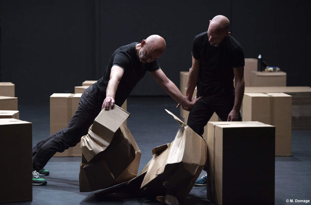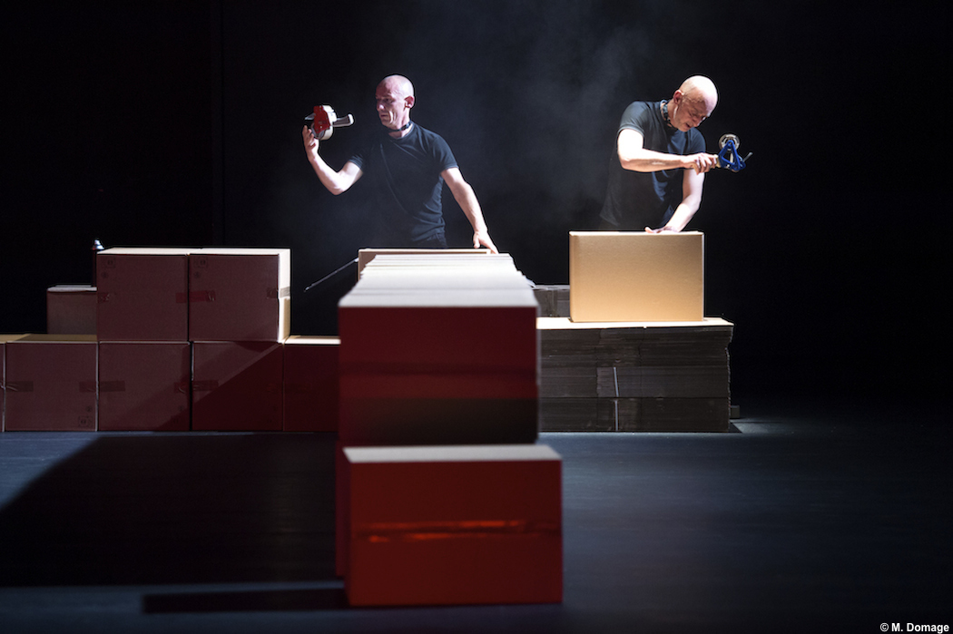 Deux manutentionnaires, préparateurs de commandes, plieurs et déplaceurs de cartons, regard hagard et gestes conformes qui les rendent jumeaux malgré une flagrante différence de gabarit, exécutent le travail, dans un vacarme industriel fleurtant avec l’électro et saturant l’espace, unique, de la scène et des gradins. Le travail à la chaîne et la conscience de l’aliénation en même temps.