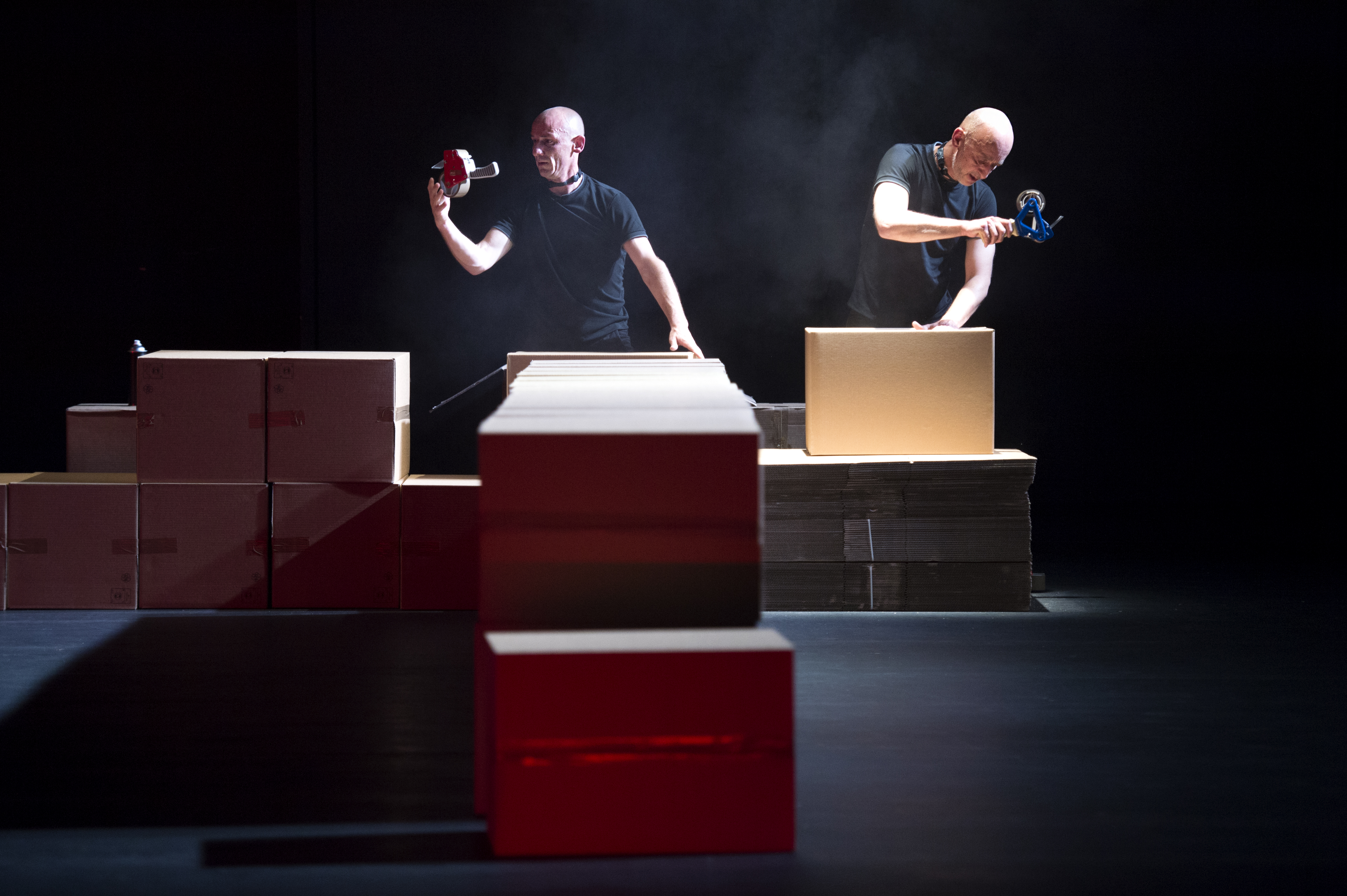 Des hommes en noir font des cartons, les défont jouent et rejouent avec. Droits, des angles qui s’allongent, vont atteindre un point qui va tout changer, normalement. Musique et voix anguleuses ou pointues, fond sonore en fait, musique. Lenteur, rythme. Cadence et scène nue, scène du théâtre des Abbesses, rien d’autres, ou presque, que les deux « danseurs », le scotch et les cartons, danse poussière. on attend, on est pris dans ce rythme, dans cette certitude, les cartons vont se casser la figure, et là, et là… Là rien, on les posent autrement, les uns sur les autres, toujours rectitude, dans une énergie contenue, l’envie de fuir n’est pas encore là, on suit cette construction avec un intérêt douloureux, lent et construit, donc douloureux puisque nous n’avons pas l’habitude. On est perdus, « ils avaient dit danse… » et l’on est presque au théâtre, pas encore complètement, mais enfin, où sommes nous ? Les questions se pressent et se bousculent. Deviennent presque pénibles et nous laissent cloués au sol, par moyen de grimper un peu, quoique. On ne sait pas, on suit, on attend. Encore. On prévoit, prédit. Tension, invention, étranglement. Puis écroulements, les cartons sont levés en lignes complètes et longues, tout va changer, nous grimpons aussi donc, nous nous relâchons, reprise, nous allons comprendre où se trouve ce « Refuge ». Nous participons en somme, nous offrons notre énergie de lassitude. Ce sont les cartons qui dansent. Les deux hommes, Raphaël Dupin et Vincent Dupont, sont des rouages, des faux rien du tout qui nous disséminent, comme ils font avec les cartons. Du concentré de talent 100%, mélange doué de théâtre et de danse que Vincent Dupont sait monter. Nous y entrons où pas ? Comment faire, la porte, où est-elle ? Comment cesser de réfléchir deux minutes, de se laisser… porter ? Puis l’explosion lente et presque finale, la bataille écrasante contre ces cartons, saccadé saccage ponctué de cet éclairage épileptique, sursautant et qui ruine tout, si souvent revu, ça pète donc on fout des éclairs à tout berzingue, ça va faire effet. Non. Encore quelques sursauts, deux échanges quasi amoureux entre les magasiniers cartonifères, puis la vie enfin. Des applaudissements hasardeux. Heureux de sortir, nous. Les applaudissements aussi sans doute. Envie de prendre l’air, de fuir. Envie de les applaudir tous les deux plus tard, chez soi, au calme. Jusqu’à ce que les voisins sonnent pour tapage nocturne.