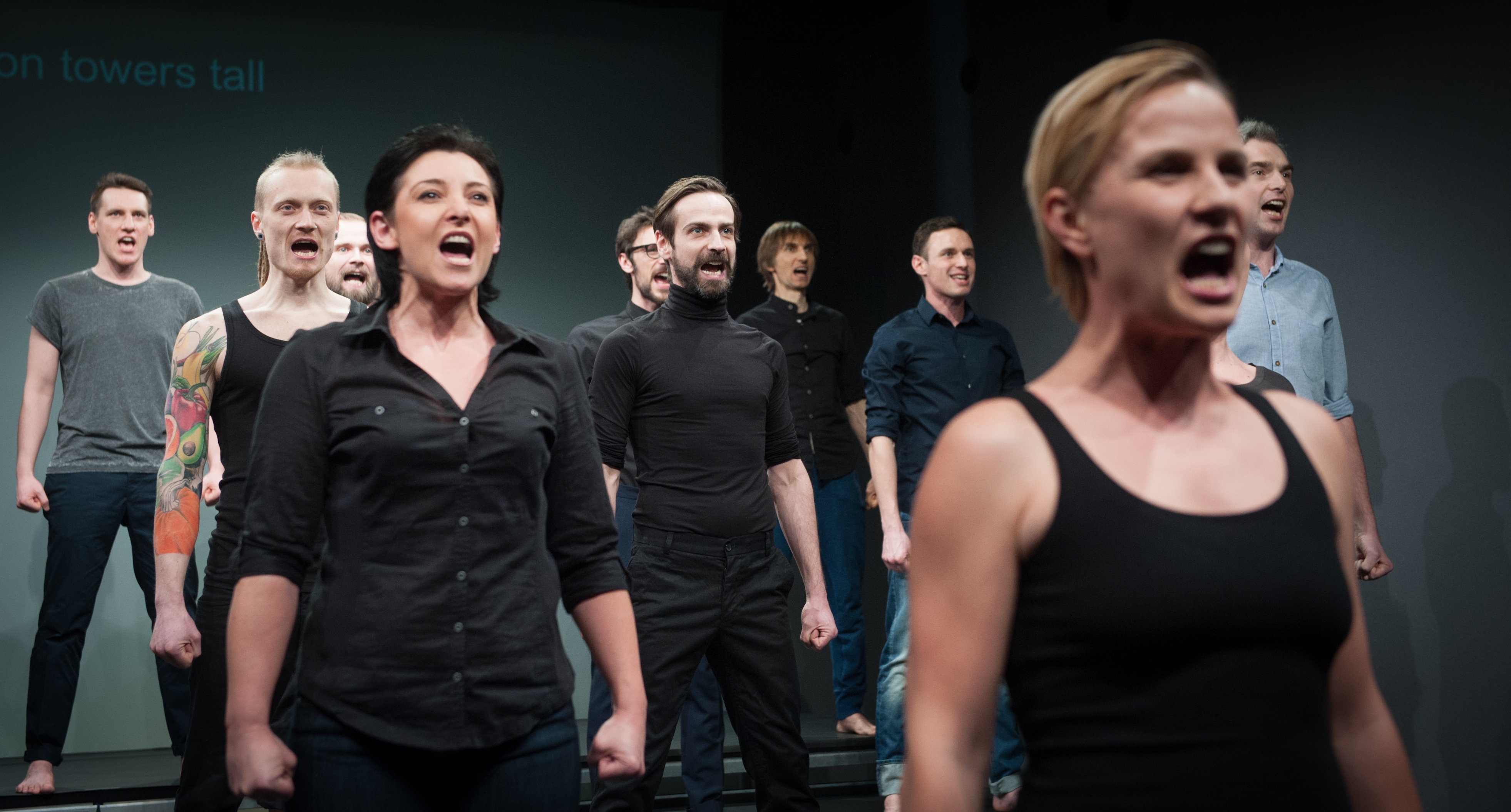 Sans préambule et face à une salle encore agitée par la proximité du dehors, un groupe pénètre le plateau au pas de course. Vingt six personnes en jeans et en chemise, petite armée hétéroclite, hommes et femmes de tous âges se mouvant en cadence, le regard fixe, le visage dur. « Nie ! » Les bouches s’ouvrent en grand pour dire le refus, pour exprimer ce qui reste d’humain dans leurs corps mécanisés.