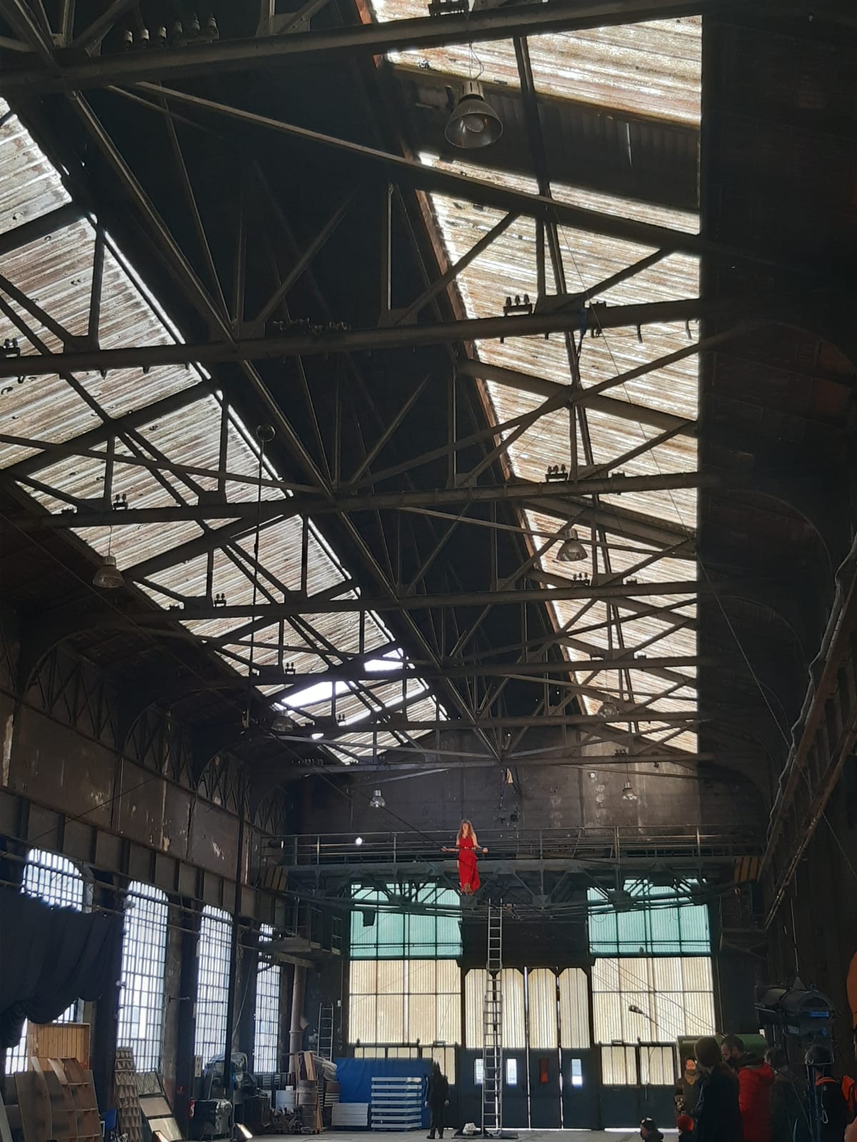 Un régisseur-loup nous accueille tout de noir vêtu, sa gueule en papier mâché nous fait prendre place dans le hangar principal. Au-dessus de nous un fil tendu à 6 mètres de long. Nous apprendrons plus tard que cette hauteur est particulièrement minimale par rapport aux 30-40 mètres habituels ! En regardant tout autour, et en l’air, on aperçoit à un bout du fil un brin de femme, pelotonnée de pied en cape dans un tissu doré.