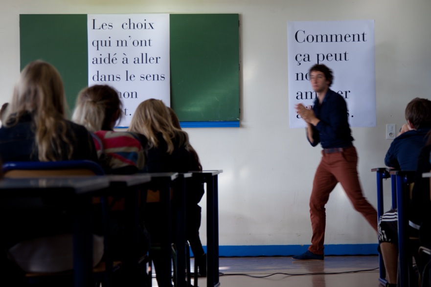 Confronté au même exercice périlleux de théâtre en lycée, Jean-Baptiste André, avec Millefeuille, fait souffler un grand moment de poésie dans les classes où il intervient. Supposément venu parler de son expérience d’acrobate formé à l’Ecole du cirque de Châlons, il joue à merveille Le Cancre de Prévert, Pierrot lunaire au texte dense et beau, qui se met soudain à faire de l’équilibre sur les tables, au milieu des rangées, prêt à s’envoler par la fenêtre de la salle. Au milieu d’élèves perplexes ou enchantés, il évoque la discipline de son travail, la perpétuelle nage indienne du circassien qui un jour croit avoir trouvé, et le lendemain doit tout recommencer.
