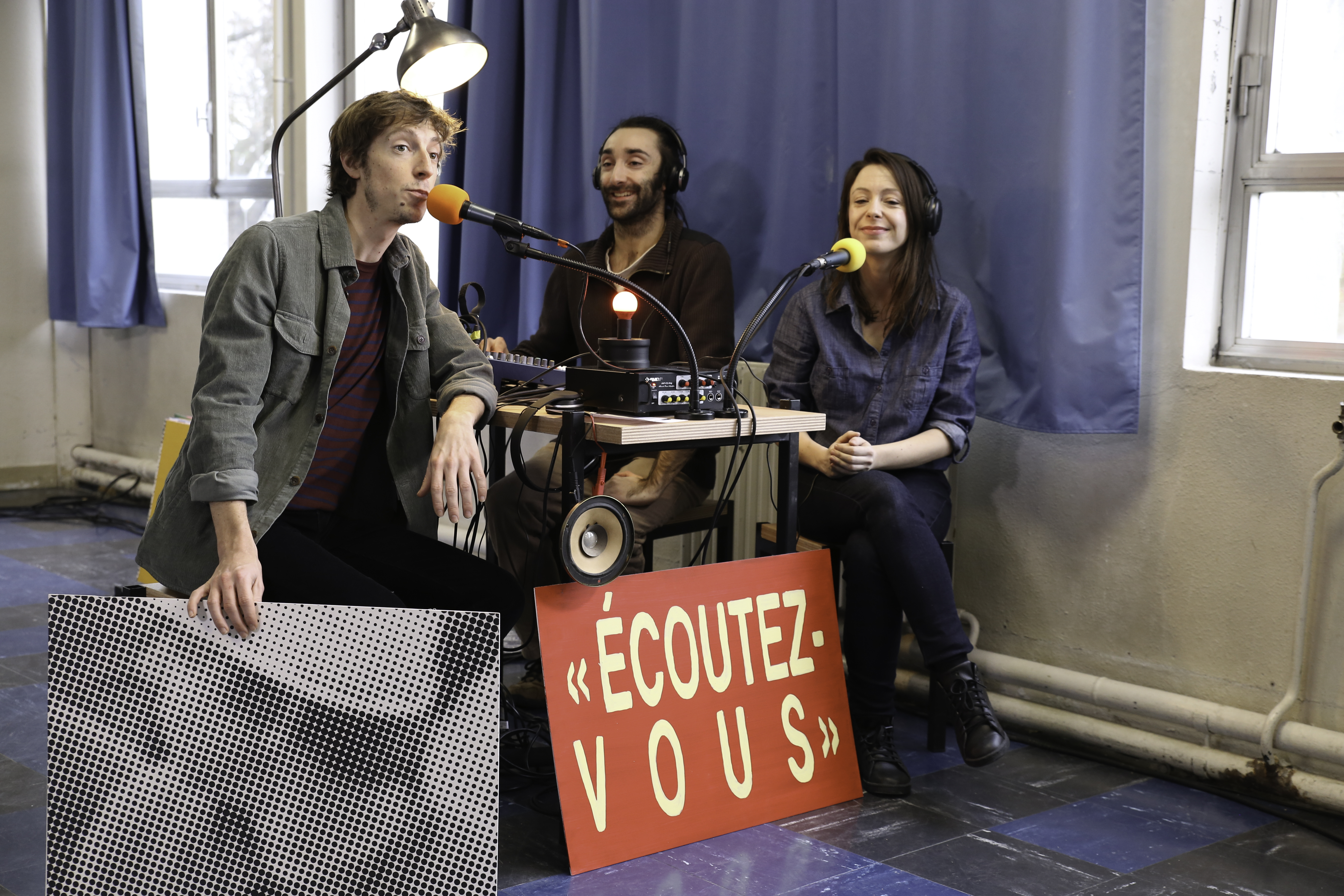 Longueur d’ondes nous ramène en revanche vers un temps que les moins de vingt ans ne peuvent pas connaître : celui des mythiques 18 mois d’existence de « Lorraine cœur d’acier », radio « libre » qui, de Longwy, entre 1979 et 1980, a donné la parole aux ouvriers de la sidérurgie, mais aussi aux immigrés et aux femmes. Bérangère Vantusso et ses comédiens ont fondé leur travail sur les archives de la radio. Ils en ont isolé quelques passages saillants, qui sont soit diffusés sur le plateau, soit « redits » par deux comédiens, qui incarnent à eux seuls nombre de personnages. Sur le plateau, une régie qui fait office de studio de fortune, des micros à bonnettes, et surtout un grand panneau quadrillé. Le dispositif est inspiré du Kamishibaï japonais, où un conteur déroule une série de vignettes qui raconte l’histoire en images. Elles sont ici créées par Paul Cox. Théâtre documentaire et illustré, donc, Longueur d’ondes interroge la portée de cette radio révolutionnaire à maint égard, faisant le lien avec « Radio Debout » éphémère voix de la non moins éphémère Nuit Debout.