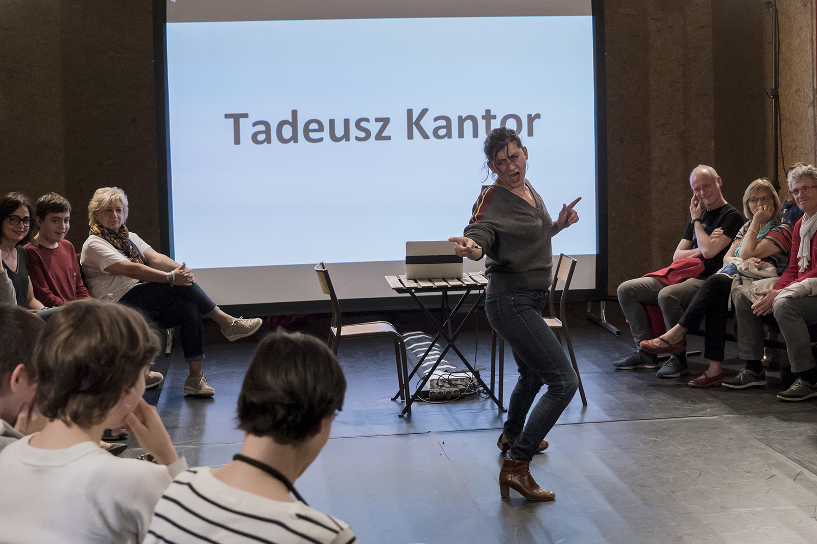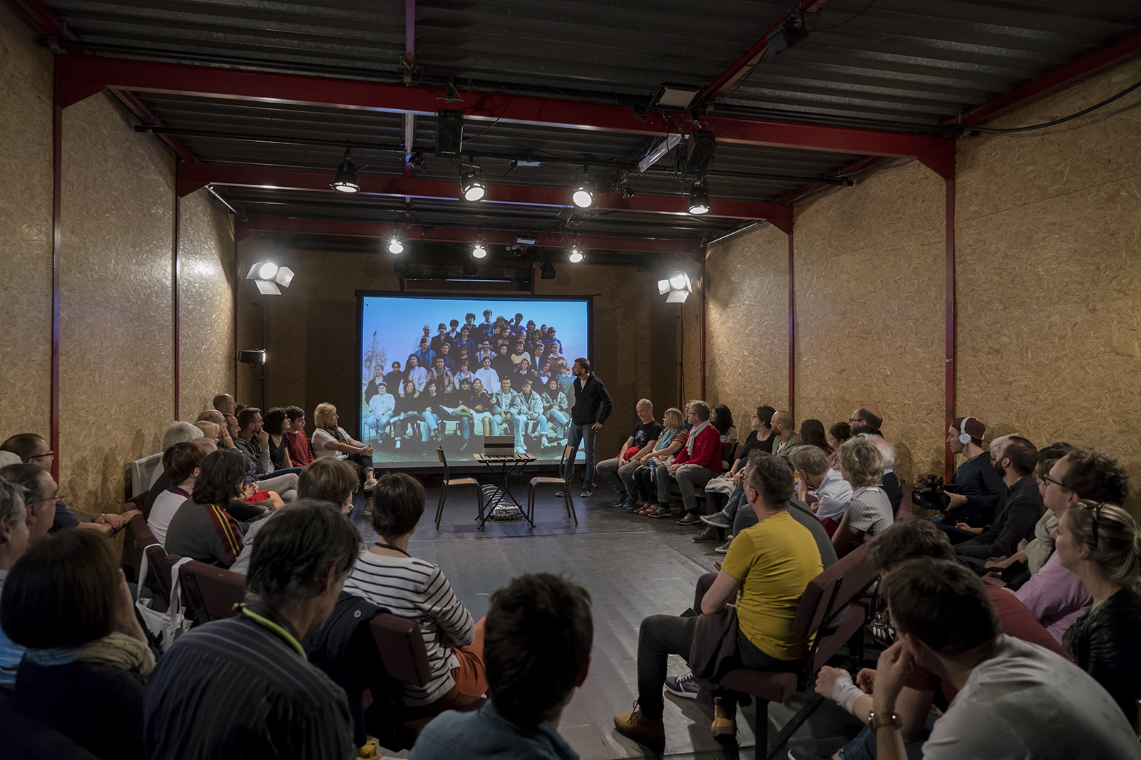 Les Imposteurs, dernier spectacle que nous avons vu, a été créé par et pour la semaine Extra. Né dans une classe du lycée de Fameck, Les Imposteurs place autour d’un cercle une quarantaine de lycéens et deux acteurs. Les comédiens, Isabelle Ronayette et Régis Laroche, reviennent sur ce qui les a conduits à faire ce métier. Tout part d’une photo de classe, celle d’Isabelle. Comment la petite fille passionnée par le foot, dotée d’un physique moins facile que ses grandes sœurs, en vient-elle à pousser la porte d’un atelier théâtre ? Pour de mauvaises raisons, sans doute, qui se révéleront essentielles et vitales. Pourquoi Régis, un soir, alors en conflit tragique avec son père, en vient-il à oublier son rôle de Sigismond, dans La Vie est un songe, alors qu’il doit parler à son père de théâtre, le roi Basile ? Les anecdotes se succèdent, sans que l’on sache si elles sont vraies ou non. Le théâtre, la vie, le théâtre, jouer ou être – on aborde des questions essentielles, on parle même, de façon très pédagogique, de La Classe morte de Kantor. C’est un vrai cours de théâtre, au sens le plus noble du terme, qui laisse la place, dans les interstices, aux interventions des jeunes gens présents, timides ou audacieux, prêts à se lancer, ou au bord du refus, la parole aux lèvres, le théâtre à portée de main. Le spectacle n’est donc jamais figé, mais reste, précisément, « vivant », dépendant de la participation des spectateurs-acteurs. Parfaitement pensé pour le dispositif de la semaine Extra, le spectacle a sans doute peu de sens « ailleurs ». On objectera aussi que les « imposteurs » lancent une fausse piste : un acteur n’est pas un imposteur – sa victime est complice de son imposture, et exige qu’elle soit parfaite. Du syndrome d’imposture, que Jean Boillot aurait sans doute voulu traiter. C’est en effet le « vrai » fondement de la comédie sociale qu’est l’existence, en effet, mais il en est finalement peu question – laissons les adolescents penser que les adultes ne sont pas des imposteurs, en effet.