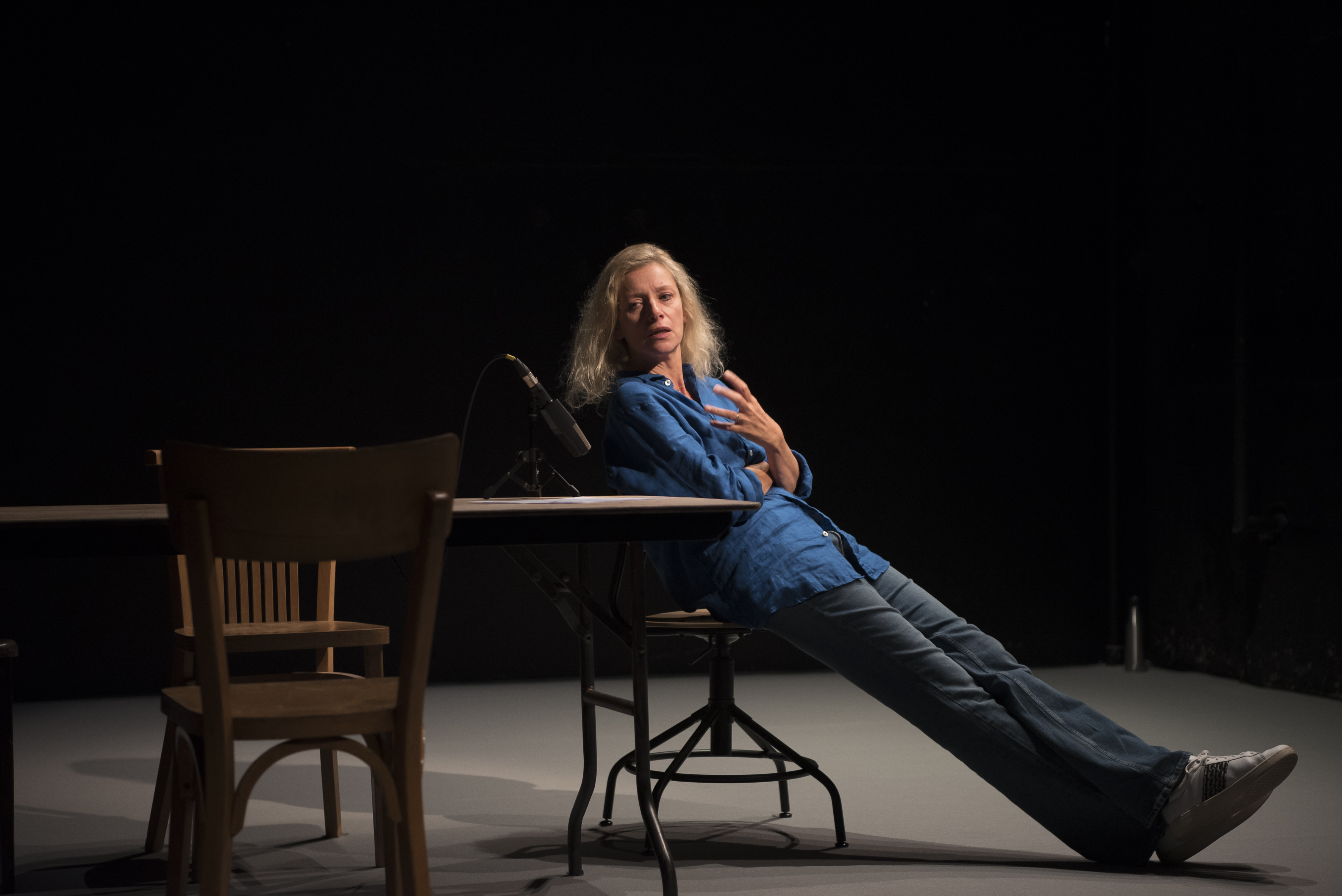 Au bout de sa table de travail, une femme lit à haute voix un texte sur son ordinateur d’une voix détimbrée. On comprend qu’il s’agit d’un écrivain qui teste la fluidité de sa prose. Elle hésite parfois, soupire profondément, réfléchit, reprend, on a l’impression de lire à livre ouvert dans son espace mental. Brusquement, la rage l’emporte, elle se lève et s’adresse au public « je me suis arrêtée là […] cela ne fonctionnait pas, ce n’était pas ça, cela n’avait rien à voir avec ce que je voulais, imaginais, j’avais perdu l’élan. » Dès lors nous sommes avec elle, Elsa Lepoivre est Delphine de Vigan aux prises avec un texte qui, elle le sait, fera l’effet d’une bombe, mais qu’elle ne peut tenir à distance.