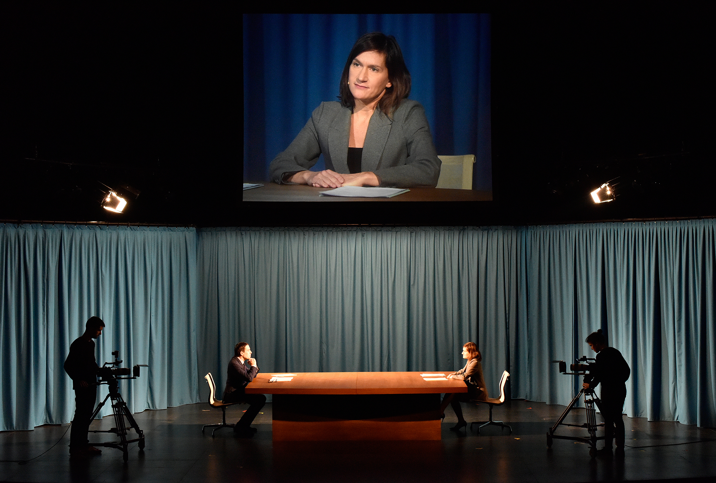 Le décor du débat de 1974 sert donc de cadre commun au spectacle : une longue table de bois blond avec de chaque côté un candidat et trois caméras actionnées par deux cadreurs qui se déplacent sur le plateau au fil des scènes. Emilie Rousset et Louise Hémon ont ajouté au-dessus de la table un écran géant projetant les visages en gros plan et des tentures en tissu bleu clair cachant le fond de plateau et les coulisses.