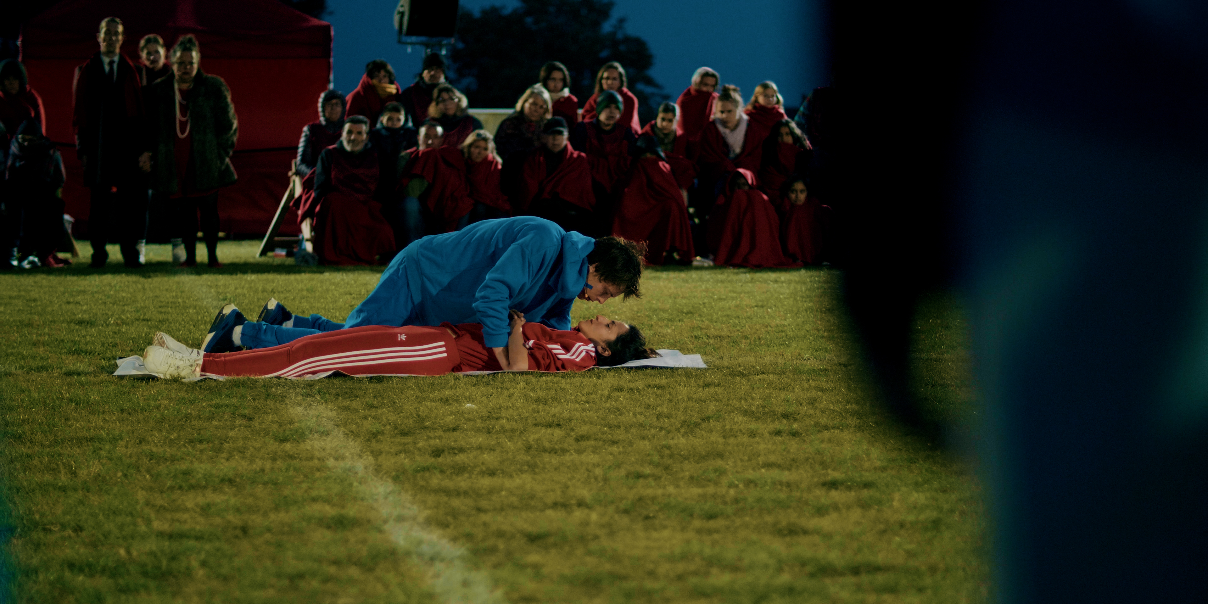 Montaigu / Capulet : match nul, 1 partout ! Romeo et Juliette de William Shakespeare ou le foot métaphore de la guerre civile qui emporte tragiquement nos deux amants. Transposer cette tragédie dans le monde du ballon rond, idée en apparence incongrue, il fallait oser. Pourtant cette création d’une intelligence épatante est une belle réussite, jubilatoire même. Parce que ce qui importe le plus ici, disséqué de belle et originale façon, n’est pas tant une histoire d’amour rebattue que le mécanisme absurde et irréversible d’une guerre civile et qui les emporte malgré eux. De la responsabilité collective ou de la responsabilité individuelle dans cette gabegie la question est posée ouvertement. Et pour ce faire il importe ici d’embarquer dûment le public avec soi. Des spectateurs d’emblée sommés de choisir leur camps. Endossant tee-shirt bleu pour le clan Montaigu, rouge pour les capulets. Divisés dés lors en deux clans, deux tribunes qui se font face, chauffées à blanc avant que ne commence le drame. Il en sera ainsi au long de cet étrange match où se joue la vie de nos personnages qui voit chaque partie se conspuer, huer nos héros, commenter l’action et pour un peu on en viendrait aux mains. Cela pourra être plaisant mais très vite cette implication collective, cette drôle de catharsis prend une étrange tournure jusqu’au malaise. La mort de Mercutio devient un instant inattendu de sidération, une mise à mort qui vous glace par sa violence inattendue. A l’instant du meurtre est choisi un spectateur à qui la « daronne Capulet » tend fermement un révolver pour abattre le personnage. Et là, on ne rit plus, on ne joue plus du tout et ce qui semblait être une comédie à laquelle on se donnait entièrement, se fracasse sur une réalité qui surgit abruptement. Cet instant bouleversant est un moment de bascule inouï où la question de la responsabilité individuelle au sein du collectif, où l’individu est mis sans façon face à lui-même, mis à nu, dissocié soudain de son groupe qui l’anonymisait. La spectatrice ce soir-là, n’a pas pu, et défaite a rendu l’arme… Par contre les Montaigu d’un seul élan, ou presque, collectivement ont baissé le pouce pour la mort de Tybald. Pourquoi alors songe-t-on soudain à « la banalité du mal » d’Hannah Arendt ? Cette logique totalitaire supprimant le sens de la liberté et de la responsabilité individuelle où l’individu se perçoit comme un rouage du système… La banalité du mal où la déresponsabilisation de l’individu. La métaphore footballistique prend dès lors et étrangement, violement tout son sens. Et c’est la force de cette mise en scène de soulever, de mettre en exergue ce qui sous-tend cette pièce et la traverse tout du long, non pas la nature d’un conflit aux origines lointaines et perdues mais ce qui l’entretient absurdement et dont sont victimes Roméo et Juliette.