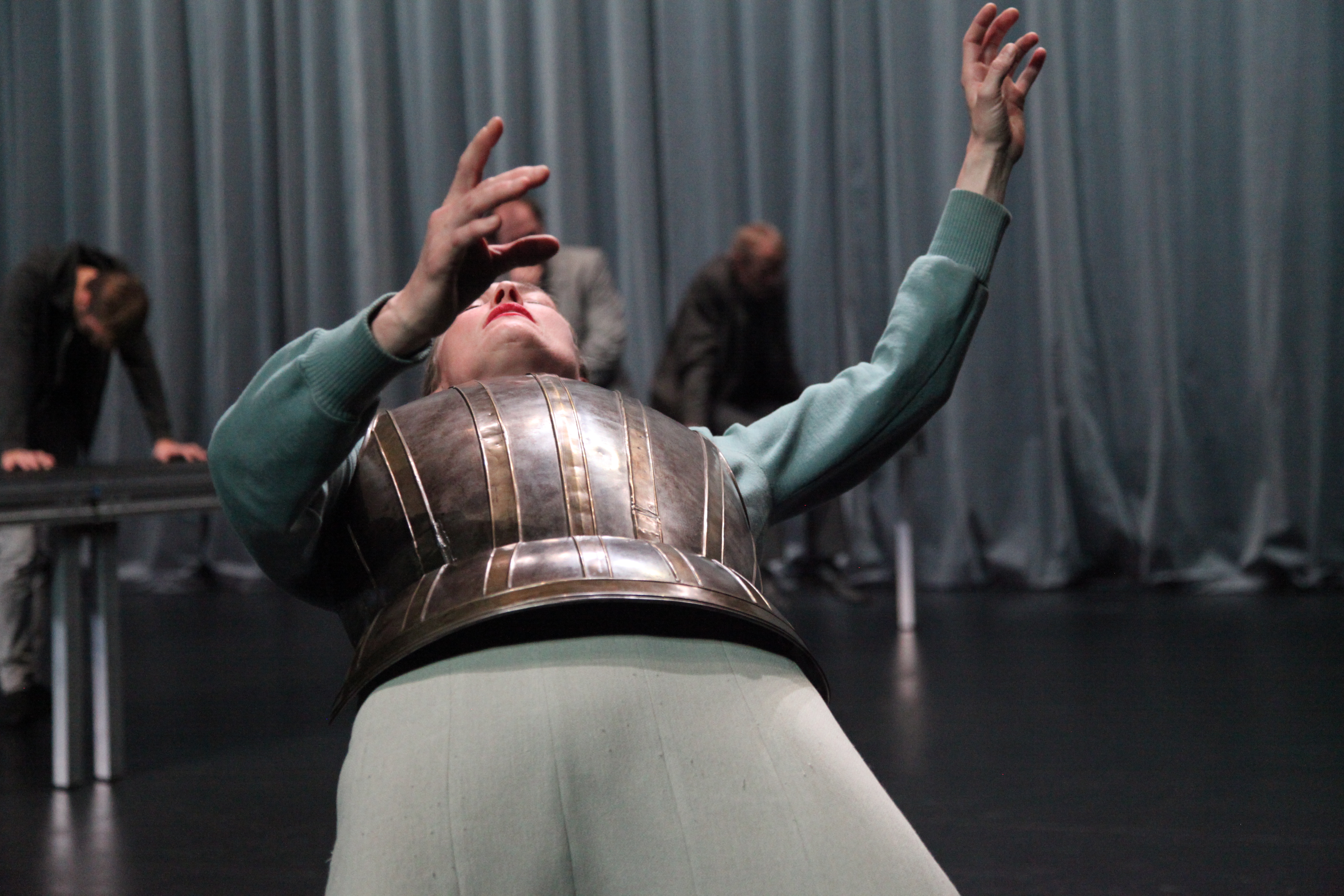 C’est un coq à l’âne propre au rêve et dont le sens échappe sans doute mais qui se révèle bien plus profond. Des images simples et dépouillées et qui vous collent étonnement longtemps aux rétines. Et il y a cette table immense autour de laquelle les comédiens tournent, sur laquelle ils banquettent ou meurent. Cet immense rideau de scène qui devient nappe de velours, jupe empesée d’une reine entravée et défaite, cape trop lourde pour un roi fragile, champs de bataille comme une mer tempétueuse. Il n’y a pas un, mais quatre Richard III. Parce que dans ce rêve on joue comme les enfants à faire comme si. Ce si magique propre au théâtre. Alors on se partage les rôles, les couronnes de papier, autant de fragments d’un kaléidoscope tragique où le roi devient soudain cheval et porte le nouveau roi. Où l’on meurt pour de faux. Où l’on tombe et se relève, s’efface et passe à autre chose, change de rôle. C’est formidablement et audacieusement lacunaire, c’est fait d’ellipses et de trous béants où s’engouffre le silence. Un silence habité de corps en attente, prêts à toute fulgurance. Des corps habités de silence et qui dansent. Branle de cour, ronde infernale, paysanne et soudain charge guerrière. Car les images jamais n’occultent les corps qu’elles intègrent comme autant de possibilités, de matières malléables propres aux métamorphoses, dans ce carrousel dramatique où tournent affolés des personnages en proie à l’horreur.