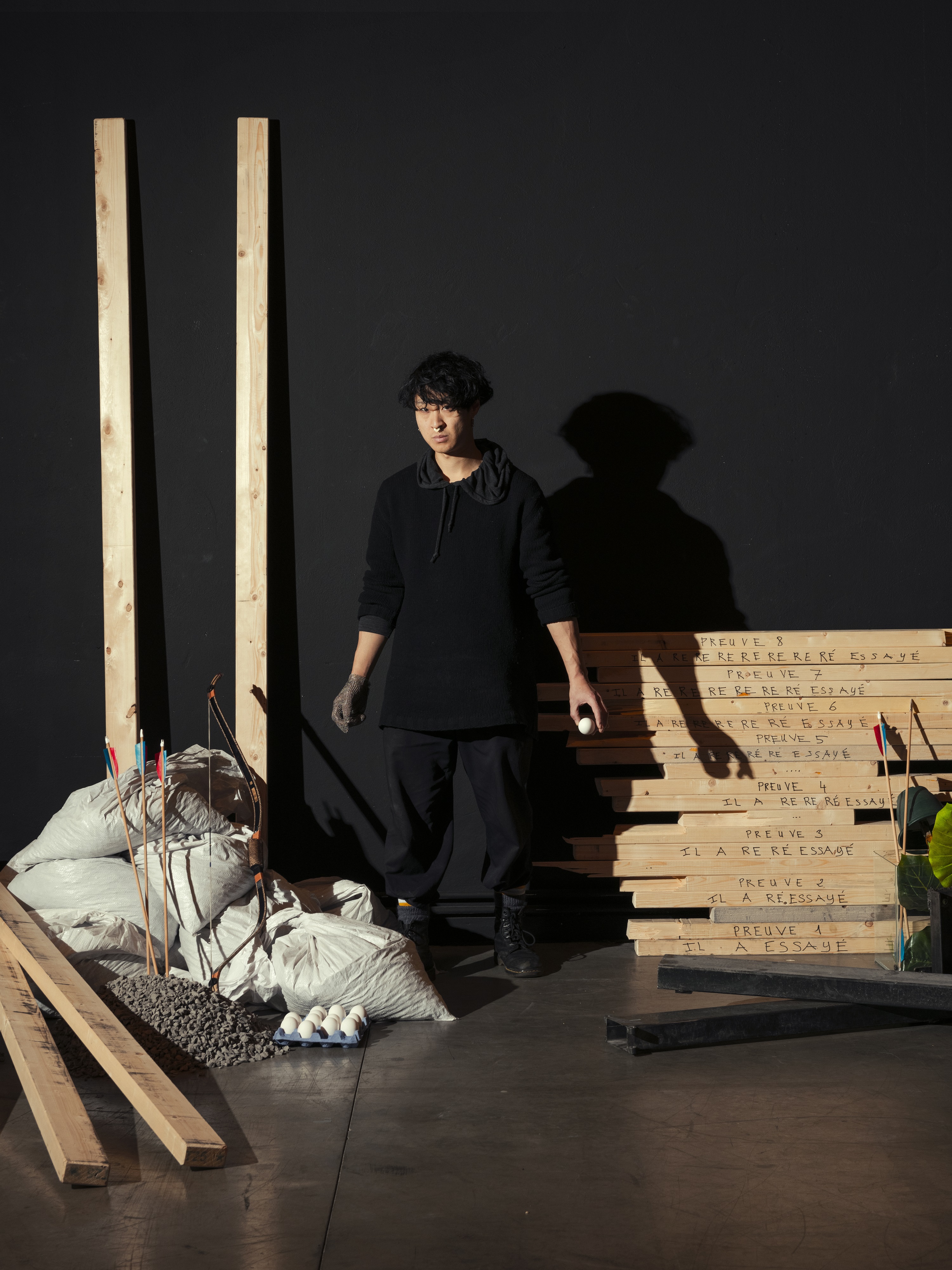 Le plateau de RUINE qui s’ouvre aux spectateurs n’a a priori rien d’une ruine. Tout y est ordonné, élégant, propre et attractif. Juxtaposés, des éléments disparates, échantillons de réalité tronquée, allant d’une carapace de tortue totem à un carré de pelouse véritable soigneusement découpé, en passant entre autres par un arc et des flèches, des œufs, une estrade, des synthétiseurs, un extincteur et des câbles électriques, le tout dans un très esthétique camaïeu allant du noir brun au blanc cassé, disposé avec soin et en attente d’un éventuel usage. Mais Erwan Ha Kyoon Larcher, issu du cirque où l’on apprend que tout peut arriver et qu’il vaut mieux savoir faire feu de tout bois et surtout à partir de rien(s), n’entreprend pas une simple « manipulation performatique » de son atelier, il va offrir la surprise — entrainant l’émotion, sans l’intention de la donner. Il y a une recherche constante de justesse et d’épuration, dans les gestes, l’espace, la façon de commencer ou de finir une action, le plus directement possible, l’action elle-même, la plus nue possible, le son, dépouillé, la référence au monde où nous vivons, implacable. Une esthétique à la fois zen et rock où la dimension symbolique se lie à la poésie du prosaïque et à l’irrévérence.