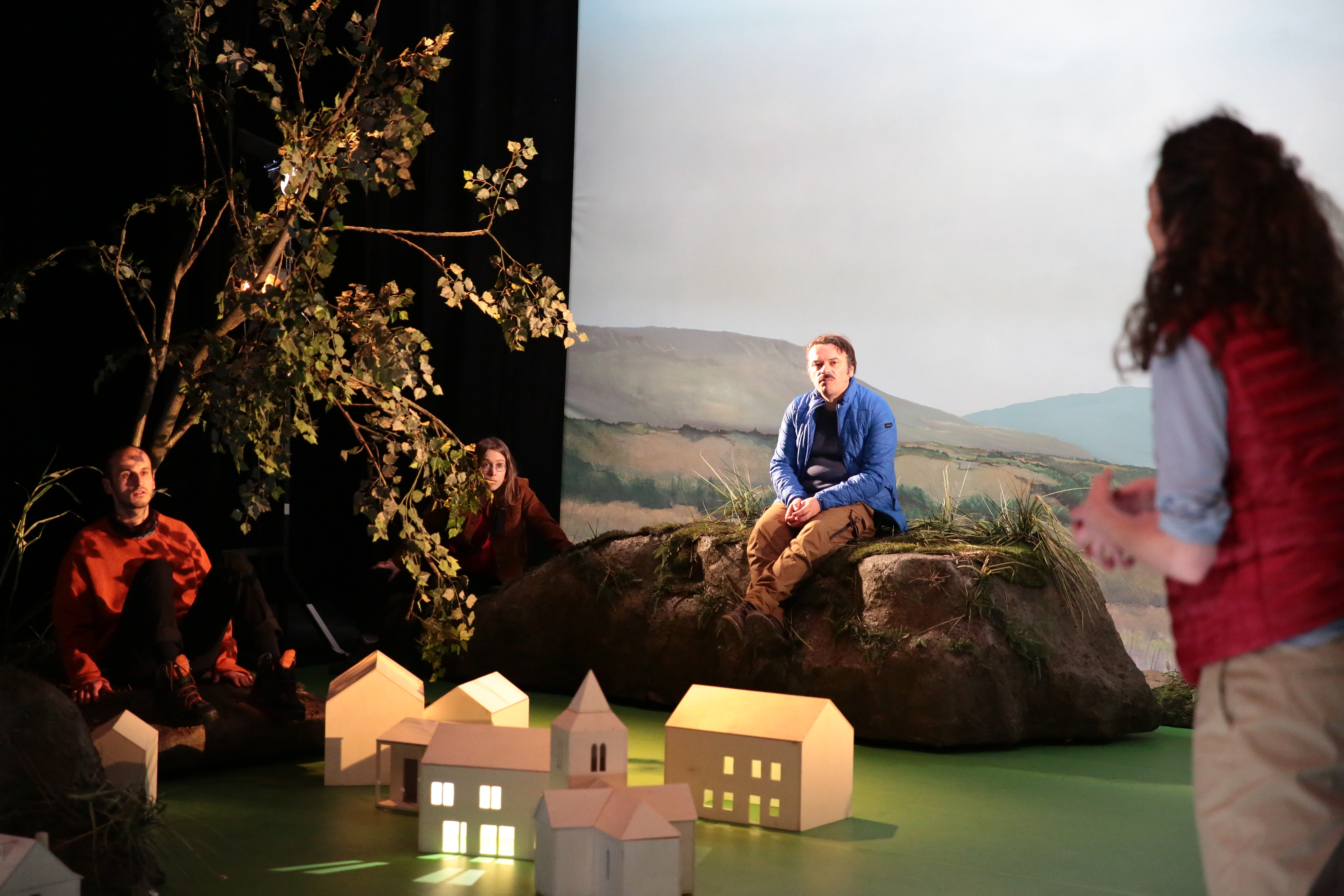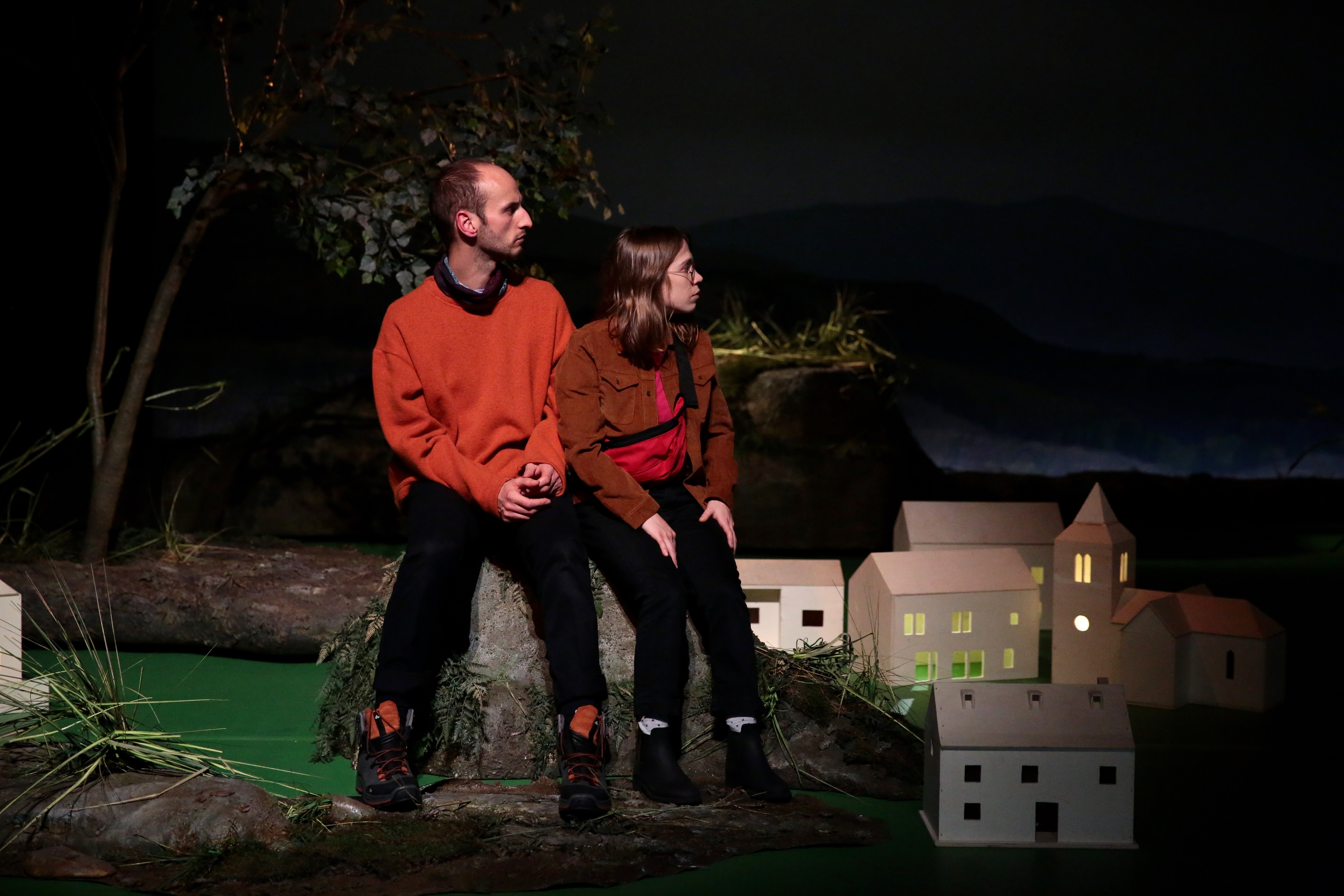 Nous sommes donc en plein dans l’esthétique du théâtre documentaire – proche à bien des égards du type « striptease », du fait d’un certain humour et d’une part de bizarrerie faite de banalité – qui, tout en déroulant son enquête, glisse peu à peu dans une dramaturgie étonnante, celle-ci s’efforçant de désarçonner le registre habituel du documentaire pour construire le spectacle selon une architecture bien plus baroque et anguleuse. Tout en jouant des codes du documentaire, cette joyeuse équipe crée une nouvelle forme de spectacle. Les morceaux et fragments de cette histoire dialoguent entre eux selon plusieurs exercices de style, et complètent un à un cette enquête faite de trous et de zones d’ombres. Le spectacle bascule enfin, et ajoute à cette investigation tout aussi artistique que journalistique une autre enquête, qui donne au spectacle une saveur plus proche du thriller ou du roman policier. En effet, c’est au travers du suicide d’une jeune fille désillusionnée et partie vivre à la campagne, que nous allons essayer de lire et de décrypter la vie à Saint-Félix. Au delà de ce fait divers, nous tenterons d’en analyser un phénomène générationnel inquiétant, qui place l’homme dans une crise identitaire forte, à la recherche de sens et de repères.