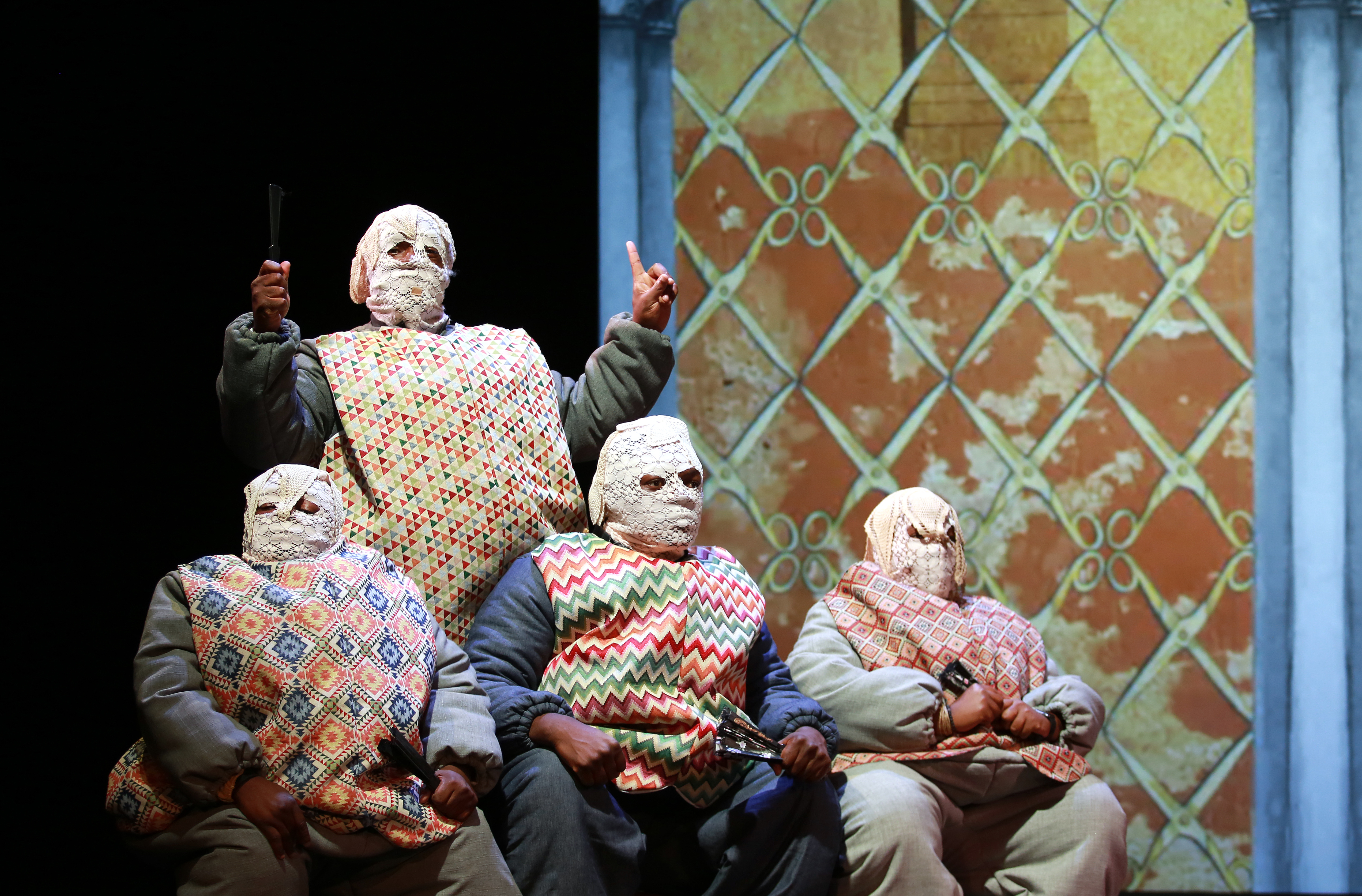 Des images vidéo de Kirsti Cumming se succèdent sur l’écran qui oscillent entre une sorte d’art naïf, de collages et de scènes très illustratives, tandis que sur scène trois comédiens revêtus d’étranges costumes nous entraînent davantage dans un registre comique et de la farce que du mythe ou du tragique. Différentes danses extrêmement énergiques prennent le relai, sans que l’on parvienne toujours à en saisir le sens, non plus que la logique, ce qui n’est en soi pas rédhibitoire, en particulier parce que l’irrationnel fait partie de la proposition. Certes Brett Bailey n’est pas un dramaturge et en cela il est difficile de lui reprocher de ne pas avoir construit une trame narrative ou à proprement parler dramaturgique. Toutefois, même s’il revendique son geste artistique comme étant non conventionnel, réfutant absolument toute approche hégémonique du spectacle vivant et avide au contraire d’une approche transdisciplinaire, Samson produit parfois davantage l’impression d’une juxtaposition d’intentions qui nuit à la lisibilité de son propos.