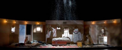 Un imposant dispositif de cloisons coulissantes en rotonde recrée l’intérieur de la chambre 2121… Lorsque les cloisons se referment, une projection de la chambre en dessin apparaît avec des phrases écrites défilant sur les murs. Le public mis en distance par ce langage interactif, voit se profiler les dessins comme une cartographie cérébrale. Mais si l’appareillage est impressionnant il n’ajoute pas vraiment de poids aux propos aiguisés de Mouawad.