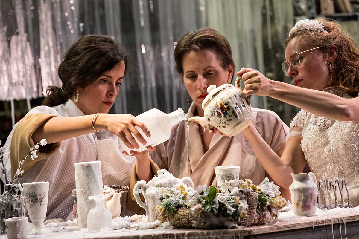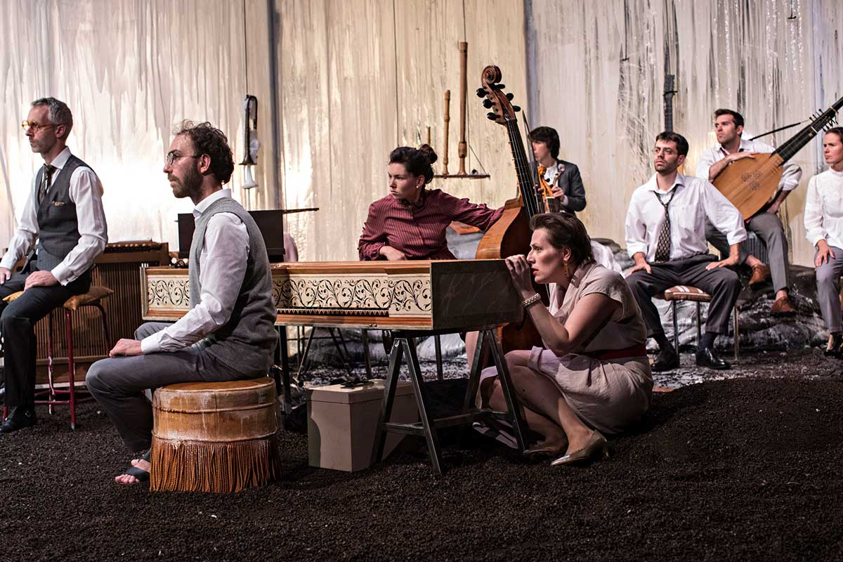 Sauce anglaise. Une mariée mélancolique, une sœur tonique, une mère neurasthénique… Songs de Samuel Achache est un spectacle qui broie du noir dans un décor de cire blanche. Au jour de son mariage, la mariée panique. Enfermée dans les toilettes elle décide de descendre en elle-même pour comprendre cette morosité qui la tue et la répétition des échecs qui ponctuent son existence. Le cœur étant le siège des sentiments c’est donc là qu’elle déboule, des cailloux plein son sac, sans être attendue. En la place est installé un orchestre au grand complet, virginal inclus, la sœur fantasmée, du moins celle qu’on aurait souhaité avoir au lieu de l’autre, la vraie, plantée devant la porte et qui toque affolée devant la situation. Et la mère tant haïe, muette. Ce qui ne s’avère pas car elle chante en anglais et merveilleusement. Le tout recouvert d’une épaisse couche de cire, rappel platonicien de nos âmes en tablettes de cire sur lesquelles se gravent nos souvenirs… et qui nous empoissent. Voilà résumé au mieux cette nouvelle création de Samuel Achache passé maître dans les univers les plus étranges, les situations les plus incongrues, et le tout musicalement accompagné de façon idoine. La mélancolie ici est son sujet. Notre personnage, Sylvia, en pleine introspection, limite border-line, d’une tristesse insondable et soigneusement entretenue, d’une mélancolie qui nous, nous fait bien rire, parce que rien de bien triste à vrai dire dans le ratage de cette vie abonnée aux échecs en tout genre. Résumé par une réplique lapidaire « (…) A la recherche de la mélancolie, ça nous a bien fait rigoler. » Pour appuyer son propos et lui donner un peu de sérieux, quand même, Samuel Achache ponctue cette création des songs anglais du XVIIeme siècle, contrepoint musical sensible des sentiments qui traversent notre personnage en proie au doute existentiel. Ça parle de mélancolie, bien sûr, d’amours impossibles évidemment, de pastorales puisqu’on rêve de chevaliers épousant une bergère, ce qui n’arrive jamais dans la vraie vie. Des songs anglais comme contre-thérapie, il fallait y penser. Parce que voilà qui semble conforter plus que consoler Sylvia devant les souvenirs, bons et mauvais, surtout les mauvais, entendre son propre malheur en échos. Soigner le mal par le mal donc. Le tout tient de l’opéra de chambre, du récital, du concert, du théâtre, de la comédie… C’est encore une fois une étrange hybridation des genres. Rien de triste, rien de pesant, malgré le sujet qui aurait pu entraîner à son tour le Théâtre des Bouffes du Nord dans une noire dépression. Il n’en est rien tant les deux comédiennes boustent leur jeux. C’est d’ailleurs ce frottement qui étonne et détonne entre cette énergie pétaradante des deux comédiennes et la langueur de la musique qui les accompagne. Malgré un sujet en symbiose Samuel Achache joue dans le traitement du contraste. Une oscillation qui donne un rythme singulier, syncopé, et rien jamais ne retombe, ne reste en suspens. Pas d’atonie dans cette anatomie de la mélancolie mais au contraire quelque chose de vivifiant. Vous reprendrez bien un petit coup de spleen ?
