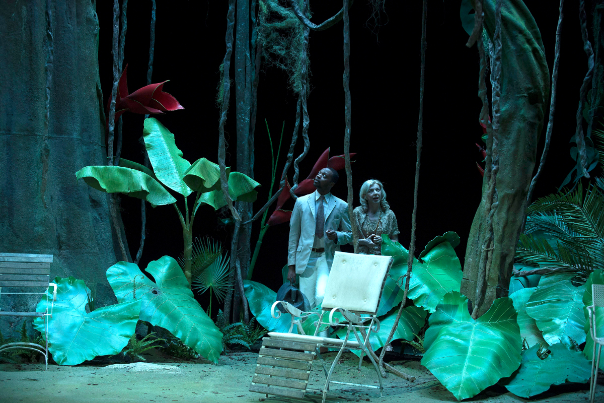 Soudain l’été dernier…A Cabeza de Logo le jeune poète Sébastien Venable est mort dans des conditions étranges, atroces semble-t-il avec pour seul témoin sa cousine Catherine. Sa version hallucinée et terrible de l’évènement est contestée par la mère de Sébastien, Violette. Violette qui pour conserver intacte la mémoire de son fils vénéré comme un dieu, loin de l’image de prédateur sexuel que décrit sa cousine, décide de faire lobotomiser Catherine. Confrontation entre deux visions d’un même événement, autour d’un absent, entre déni, réalité ou fantasme, c’est un voyage au bord de la folie, au confin de la psyché humaine où la réalité et sa perception se révèlent des plus ténues, fragiles. Tennessee Williams signe une pièce étrange, brève, explorant les frontières entre le bien et mal. Une pièce sur la dévoration des êtres, voire l’auto-anthropophagie, une allégorie qui trouve peut-être sa clef dans cette scène décrite par Violette des oiseaux carnassiers se précipitant sur les bébés tortues à peine éclos et rougissant le sable de leur sang. Une pièce qui reste sur un mystère car le récit hallucinatoire de Catherine ne résout pas la question de savoir comment est mort Sébastien, ni qui il était réellement, mais dénonce au final les béances des personnages, leur blessures psychiques profondes. Tennessee Williams ne tranche pas entre le fantasme et la réalité peut-être parce que le premier porte la révélation d’une réalité autrement plus violente, et que la seconde ne peut se comprendre qu’au regard de celui-ci. Stéphane Braunschweig respecte un postulat souhaité par Tennessee Williams, inscrire l’œuvre non dans le réalisme mais dans une projection mentale, un enfermement étouffant et quasi sauvage à l’image de cette forêt luxuriante qui fait office de salon, un jardin du bien et du mal où racines et lianes s’entremêlent, serre tropicales en lieu et place d’une cellule capitonnée. Etouffant huit-clos. Certes la pièce est bavarde, certes elle paraît quelque peu datée. Mais une fois dépassé ces préventions et c’est ce qui intéresse au premier chef le metteur en scène, l’intérêt se porte sur le processus mémoriel, la fabrique du souvenir et la reconstruction de la réalité frottées aux traumas subis, en relation ou non avec l’événement traumatique conté. Ainsi le viol le Catherine, qui n’est pas mentionné dans le film éponyme de Mankiewicz, se frotte en écho au récit de la mort de Sébastien. Comme ces fougères où cet arbre au centre du plateau, les racines traumatiques plongent profondément en chacun des personnages et ressurgissent en rhizomes au-delà de l’événement traumatique. Stéphane Braunschweig allège avec justesse sa mise en scène, centrée principalement sur ces deux femmes enfermées chacune dans leur vérité et dont elles ne sortent pas. Il ne tranche pas, ne retranche pas, n’apporte volontairement aucune réponse. Au spectateur de conclure dans le doute. Quand Catherine franchit la porte, belle trouvaille que ces murs capitonnés qui enferment bientôt cette jungle et les personnages, lieu à la fois ouvert et fermé, on ne sait si elle réintègre l’hôpital où si elle en sort définitivement. Mais elle précipite avec elle dans l’enfer, après ce récit inouï de l’événement de Cabeza de Logo, l’ensemble des personnages. Même la dernière réplique, celle du psychiatre au nom troublant de Sugar, bel euphémisme, ne lève aucunement le voile sur le mystère de Catherine, pas plus que sur celui de la mort de Sébastien. Stéphane Braunschweig n’élude pas les dialogues, la pièce je l’ai dit peu sembler bavarde. Il en fait comme la colonne vertébrale de sa mise en scène. Ce sont comme des récits enchâssés, emboités les uns dans les autres, entrelacés comme ces lianes qui pendent des cintres jusqu’au plateau. Pas d’actions, de mouvements ou si peu. Ce sont ces dialogues qui donnent l’impulsion, la dynamique à l’ensemble. Ces logorrhées verbales, qui demandent des acteurs remarquables pour projeter sur le plateau des images dynamiques se substituant à l’action absente, recèlent des clefs pour entrer dans la psyché de ces personnages au bord de l’abîme. C’est presque qu’inconsciemment, en toute innocence relative, qu’ils se mettent à nu par des images, des allégories données pour réalité, des visions cauchemardesques pour vérité. Violette au Galápagos observant la réaction de son fils devant les oiseaux déchiquetant les tortues de mer trace un portrait terrifiant à l’encontre de celui qu’elle défend becs et ongles. C’est cette cruauté tant mentale que charnelle qui est à l’œuvre dans cette pièce et que Stéphane Braunschweig souligne sans jamais appuyer. Mais jamais folie ici n’avait eu paradoxalement un visage aussi normal. C’est par les dialogues qu’elle suinte. Ce qui règne dans cette mise en scène c’est justement ce calme étrange, cette camisole feutrée de normalité que le metteur en scène semble avoir carapaçonnée autour de chacun. Même dans la veulerie des parents de Catherine dont l’enfermement arrangerait également leurs affaires. Le récit visionnaire de Catherine, la mort de Sébastien à Cabeza de Logo, n’est jamais dans l’hystérie, la démonstration, mais vécue comme une vision traumatique douloureuse, presque intime. Même là Stéphane Braunschweig évite soigneusement l’écueil du trop. C’est justement la force des acteurs, corsetés dans leur folie, de ne jamais sombrer dans l’outrance. De brider leur jeu. On peut reprocher le jeu monolithique de Luce Mouchel (Violette) mais il est le reflet de cette psychorigidité de mère intrusive et abusive, incestueuse, sans laquelle elle s’effondre. Marie Rémond (Catherine) est d’une totale ambiguïté, elle ne délivre rien, tout entière à son récit, sans recul et sans jugemen