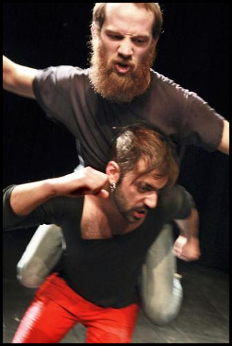 La danse est un sport de combat ! Et si le terme de danse-contact peut s’appliquer aux deux gaillards qui investissent le plateau du Théâtre de la Bastille, il est un peu faible. Cela tient ici du pugilat furieux, de la scène de ménage dopée à la testostérone. Le choc des titans. Pas vraiment le format académique, hirsutes et barbus, ces deux-là s’aiment avec une passion dévastatrice. Et un humour ravageur. Les corps s’entrechoquent, se chahutent et chutent avec fracas. Ça fait crac et ça fait boum ! Il y a bien quelques mouvements de danses reconnaissables mais vite parodiés ou détournés. Il y a de superbes portés, audacieux même, hilarants toujours, qui finissent par s’effondrer, le corps soudain catapulté s’écrasant sur le plateau quand ce n’est pas sur les spectateurs. Ça s’empoigne sec. C’est fort, fort rude. Avant de s’embrasser ou s’empoigner brusquement avec une tendresse de nounours, étreinte qui se termine immanquablement par un étranglement sournois. L’amour vache… Et justement il y a une sacrée part d’animalité chez ces deux athlètes. De vraies bêtes ! Qui grognent, rugissent et se mordent. Point de discours, ou si peu, mais de vrais borborygmes. Ça peut sembler primaire mais c’est formidablement ludique. Et primaire, oui, aussi finalement. Quelque chose de profondément instinctif et jouissif, purement, joyeusement physique. Organique. Ils se lâchent véritablement. Et dans tous les sens du terme. Jusqu’à se mettre à poil et jouer sans fausse pudeur de leur sexe, arme de destruction passive, comme des gosses innocents. Car il y a bien aussi un côté sale gosse, celui de jouer à, à faire comme si, ce si magique qui vous métamorphose en T-Rex, en tigre féroce, en diable de Tasmanie.