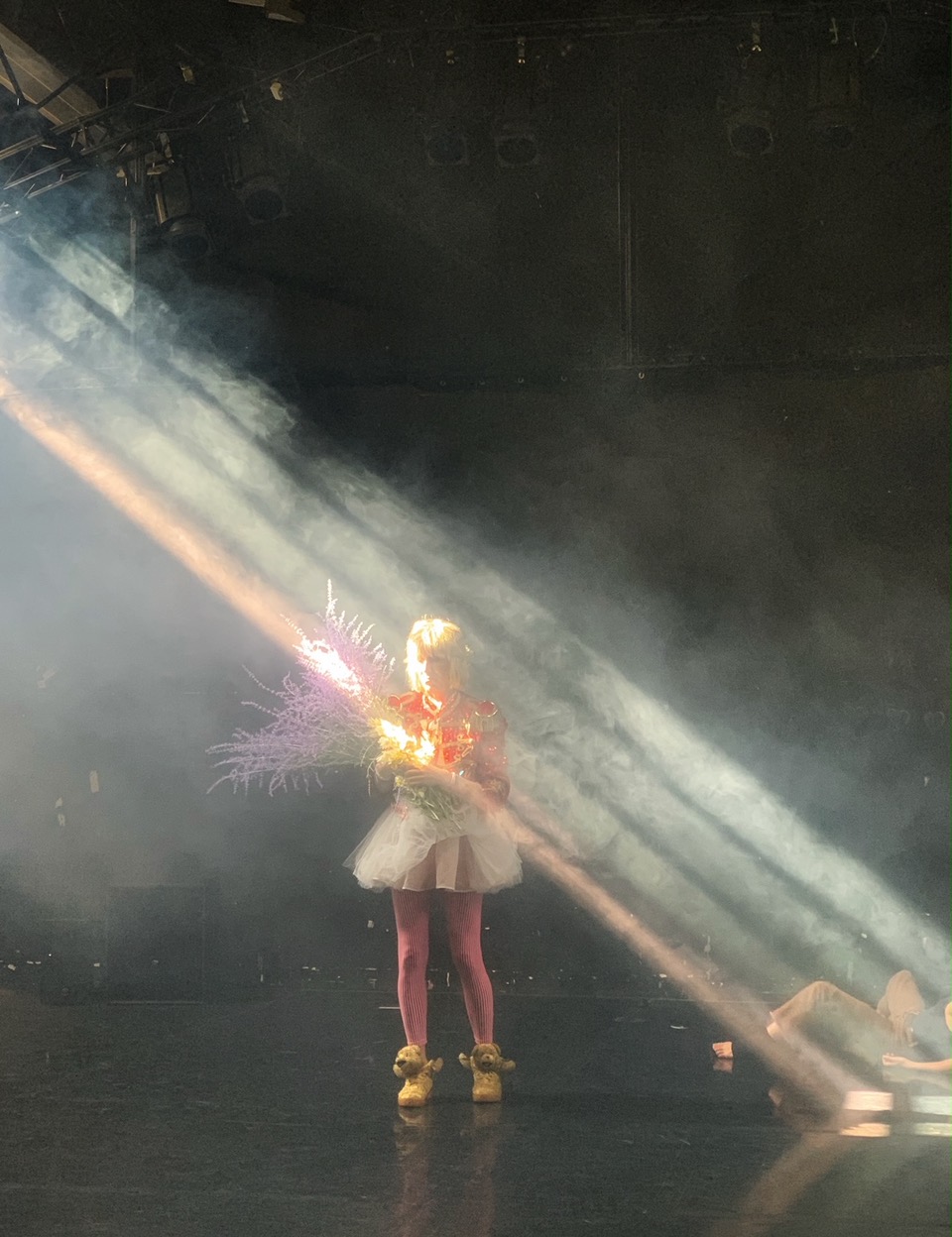 Un coup de dés jamais n’abolira le hasard, Mallarmé bien sûr. Un coup de dés produit son coup de théâtre, sans le drame. Un tutu blanc, une veste de majorette, une machine à fumée, un rap de Bagnolet, une voix enregistrée annonçant « le plus beau sourire de la salle », des danseurs, des clowns, sans que l’on parvienne à identifier qui est qui, Dalida, Fanny Ardant, Yves-Noël Genod, La Argentina, Kazuo Ōno, Maïa Plissetskaïa… inépuisable corne d’abondance spectaculaire, à secouer fort comme un cornet à dés (Max Jacob bien sûr). Avec jubilation, gourmandise et une touche certaine de malin plaisir, Yaïr Barelli est le grand ordonnateur de l’aléatoire et de la combinatoire, qu’il foule allègrement du pied de l’instant. Le chorégraphe et concepteur de Sur l’interprétation – titre de l’instant s’adonne aux rencontres de hasard : des spectateurs arrivant en retard ou sur le départ, traversant l’espace de jeu (à moins qu’il ne s’agisse de l’espace du Je ?), la lumière du soleil fusant d’une lucarne et traçant ses rayons comme dans une peinture religieuse, des émeutes conduisant à relocaliser en intérieur ce qui était prévu à l’extérieur…