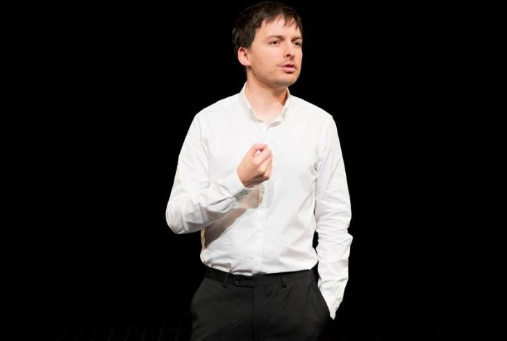 Ce ton absurde est tenu pendant tout le spectacle, sans pratiquement aucune baisse de rythme. De la description amusée de son look, improbable, d’homme sans qualité en guise d’introduction à rallonge, jusqu’aux épisodes plus grinçants sur sa vision de la mort, signe que le comédien sait aussi varier les tons, Chris Esquerre reste d’une humeur égale. Le comédien manie l’absurde, la dérision et l’autodérision comme peu de gens, au point d’en devenir mystérieux. Même le livret du spectacle est un exercice d’écriture monotone et d’humour décalé.