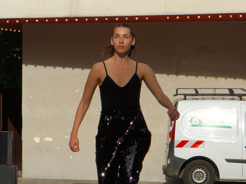 Lorsque la porte éloignée en fond de scène s’ouvrit, laissant apparaître un homme habillé d’un survêtement gris clair, c’est encore un tout autre imaginaire qui jaillit dans le vide de la salle blanche, coach sportif, homme politique, homme de pouvoir, homme de l’ombre tirant les ficelles, prenant en main la chorégraphie, serrant le corps de la danseuse à la taille, la faisant sauter de plus en plus haut. Citons ici Julien Monty dont la présence entre impassibilité et transparence est du plus grand effet comique, se révélant finalement homme à tout faire.
