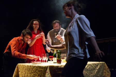 Tout se situe autour de la table. La table qui, d’ailleurs, donne souvent l’occasion de se réunir pour commencer le travail au théâtre avant de passer à la scène. La table qui détermine nos places lors d’un dîner de famille. La table qui hiérarchise quelque part nos statuts, qui conditionne, le temps d’une réunion ou le temps d’une vie au sein de la cellule familiale, les rôles que nous avons à jouer. Toute une histoire autour de la table, jusqu’à faire « table rase ». Jusqu’à ce que tout périclite et se délie. C’est de ça dont il s’agit dans Tabula Rasa, un spectacle signé par la joyeuse troupe belge, à voir au Théâtre des Doms.