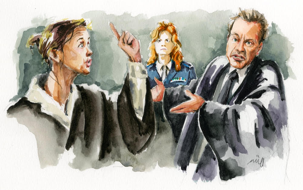 La scénographie et la mise en scène sont réduites au strict minimum. Le président est juché sur une chaise et table hautes à jardin, la procureure assise à une table normale à cour, l’avocat et l’accusée en retrait derrière elle. Le régisseur est également sur le plateau et le dessinateur de presse Zziigg juste devant, qui croque, comme dans un véritable procès où les caméras sont interdites, les différents protagonistes. Un témoin (Mme Meiser, qui est aussi partie civile) est assis parmi les spectateurs qui le découvrent au bout d’une heure quand il est appelé à la barre. C’est la seule surprise véritable de la mise en scène (avec celle qui est de faire dire le début de l’Acte I au président à l’extérieur du théâtre avant que les spectateurs n’y entrent). Certes le texte de von Schirach mérite à lui seul le déplacement et on sait gré à la compagnie Hercub’ de le monter pour la première fois en France, après avoir créé un autre texte puissant (Espace Vital de Israel Horovitz).