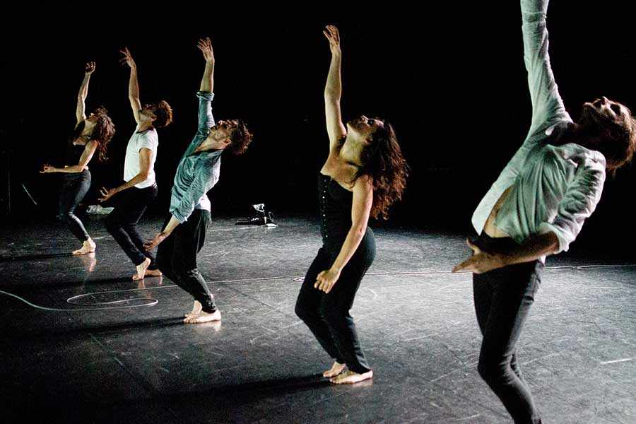 Ce travail de désorientation sensorielle et visuelle s’avère particulièrement efficace, tant chaque image est un choc physique pour le spectateur. Ann Van den Broek n’est toutefois pas qu’une illusionniste. Au delà de la désorientation du public, son ambition est de créer de nouvelles formes. Le choc physique se double d’une invention esthétique particulièrement riche. Ainsi les ombres des danseurs projetées par la lampe de la chorégraphe font naître des êtres fantasmagoriques sur les murs du théâtre, géants aussi impressionnants que monstrueux. Le plateau finit par être complètement envahi lorsque la chorégraphe projette ces ombres depuis le public. La scène est alors striée des membres de danseurs, alors que certains continuent à danser sur scène. La simplicité du dispositif renforce encore la beauté de l’invention. La chorégraphe abandonne parfois ce dispositif pour revenir à une mise en scène plus classique. Trois hommes alignés en diagonale se relaient devant la lampe d’Ann Van Den Broeck. Le talent de chorégraphe explose alors. Répétant des séries de gestes brusques, saccadés et violents, les trois hommes brillent sous la lumière fébrile de la chorégraphe.
