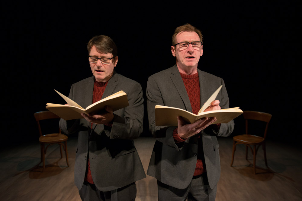 Tim Etchells, de Forced Entertainment, avec intelligence se refuse, on peut dire ça, à adapter ce texte. Il est donné dans sa forme première, lu par deux artistes exceptionnels, Richard Lowdon et Robin Arthur. Lu texte en main – The notebook – et subtilement mis en scène. Un minimalisme et une grande minutie, qui laissent ainsi toute la place à cette écriture singulière dans sa forme et sans faire obstacle non plus au contenu du récit. Habillés à l’identique, même costume avachi et même pull bordeaux, chaussés des mêmes lunettes, Richard Lowdon et Robin Arthur s’expriment d’une même voix, d’un même souffle. Sans passion et comme détachés d’eux-mêmes et des événements relatés. C’est un « nous » gémellaire quelque peu effrayant. Ils ne se ressemblent pas, non, mais bientôt, au fil du récit, l’illusion est là, l’illusion est telle qu’on ne les distingue plus l’un de l’autre. Ils ne font plus qu’un. Et sur ce plateau nu, ce qu’ils expriment là sans affect apparent, sans émotion aucune, d’une voix aussi blanche que l’écriture, dans une synchronisation parfaite, et malgré un humour noir propre au texte qu’ils semblent ignorer, est indicible. Il sourd bientôt un étrange malaise qui s’épand lentement comme un mascaret que rien ne peut arrêter. Et toute la force intrinsèque de ce roman, dans son propos sans appel, vous submerge et vous noie bientôt. Le récit prend ainsi une formidable densité, la parole une remarquable intensité. Une création d’une force inouïe dont on ne sort pas tout à fait indemne, ébranlé même, au regard de notre actualité…