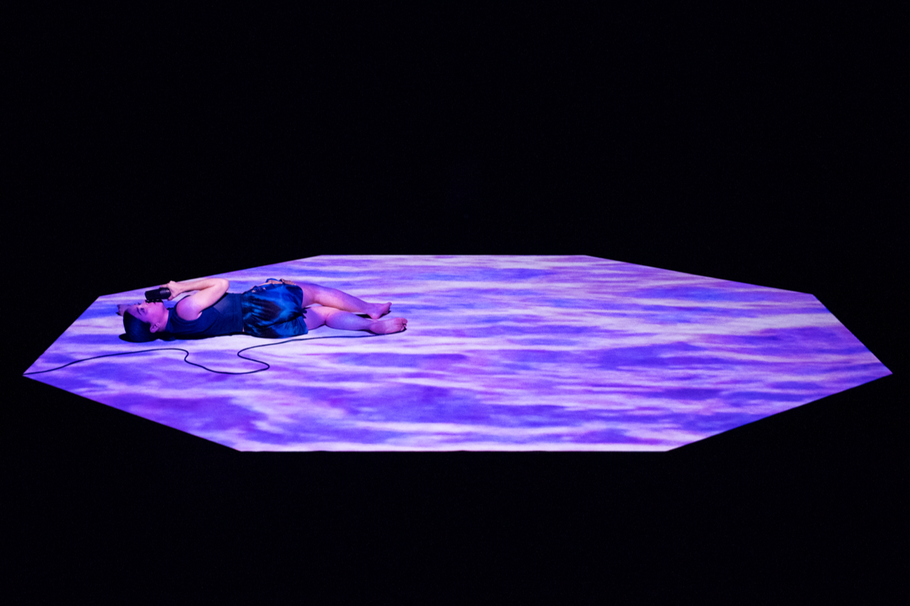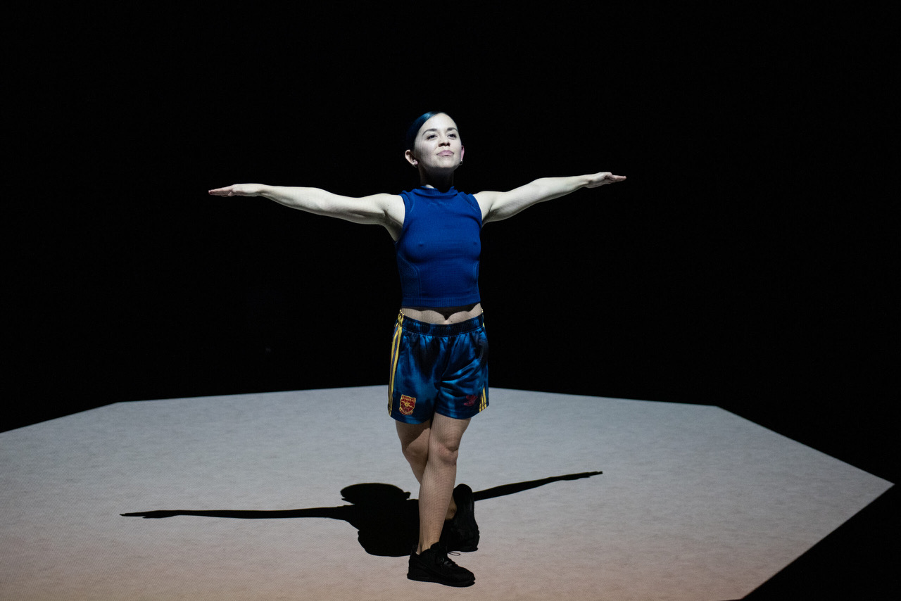 Un octogone blanc au sol, espace de jeu et d’enjeu, lieu de projections. L’octogone, figure à huit faces, je pourrais le décrire comme la tentative avortée d’une ligne courbe, circulaire, approximativement tracée en lignes brisées. De manière très semblable, la sinuosité infinie d’une existence est rabattue au gré des normes, des schèmes culturels, des us et autres coutumes qui régissent notre tribu occidentale et ramènent à la ligne droite nos élans. Courtney May Robertson est allongée au centre de l’octogone dans la pénombre envahie progressivement par des flux de vidéos. Un micro en main, elle déroule d’une voix modifiée par un filtre aux intonations numériques une longue anaphore. « This body… ». Ce corps : formé, entraîné, cerné, épié, machiné, préparé… Effet de la voix transformée, effet aussi et surtout de l’écart entre immobilité de Courtney May Robertson et vitesse des images sur laquelle elle repose, l’impression troublante se dégage qu’elle nous parlerait, qu’elle agirait, à côté ou au-dessus de son corps comme dans ces expériences transcendantales du type « near death experience ». Ou comme depuis un vol plané après avoir été éjecté d’un cheval parti au galop.
