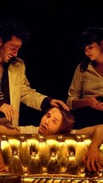 Il ne s’agit pourtant pas d’une sorte de parcours initiatique (un être réalise qu’il a pris le chemin de l’erreur et oriente alors sa vie dans une autre direction). L’histoire commence au moment où Toby a déjà commencé à dévier de son chemin. On devine sa vie passée comme pleine d’orgueil, d’arrogance, de mépris pour les autres. Toby ne reconnaît même pas sa première femme, épousée en deux jours, sur un coup de tête. Mais Toby ne peut pas changer pour devenir meilleur, il n’y a pas de rédemption possible, et encore moins d’issue. Toby est en effet devenu Toby pour le monde entier désormais, partout il est reconnu: « Il n’y a pas d’extérieur ». Sa vie pré-décidée, toute tracée, n’est plus la sienne. Ainsi nous assistons à ce que l’on pourrait appeler le déraillement de l’étoile filante, vers sa fin, inéluctable. Toby a des remords, sa conscience se réveille par la voix d’une mystérieuse petite fille. On ne sait pas si elle est un fantôme ou une voix intérieure, ou peut-être encore bien réelle. Si cette histoire prend l’allure d’une tragédie, elle est pourtant parsemée de moments comiques. Plusieurs personnes veulent se venger de Toby, et pistolets à la main, se disputent pour passer en premier. Toby finit par recevoir une balle quand même, et sa mort est jouée au ralenti, ce qui produit un effet particulièrement grotesque (on pense à un moment similaire dans L’Armée des douze singes, de Terry Gilliam). La critique ne vise pas seulement notre culte actuel des stars (sacrifices de sommes folles pour certains concerts, curiosité avide pour la vie privée des stars dans la presse people etc. ) mais aussi nos sociétés occidentales contemporaines dans lesquelles l’ennui paraît comme le pire ennemi qui soit. Aujourd’hui, tout nous pousse constamment à nous amuser, à nous distraire, coûte que coûte. La mise en scène de Frédéric Sonntag évoque au tout début l’ambiance des boites de nuits, à coup de fumigènes et de lumière saccadée. Un énorme canapé doré connote les ambiances kitsch d’appartements luxueux de stars ou d’émissions télévisées ridicules (Star Academy, Loft Story… etc. où de parfaits inconnus visent à se faire connaître en passant à la télé). La vie de Toby est une farce, une farce ridicule. On ne peut pas nier que l’ambition de départ de cette pièce est bonne, mais elle finit par se vautrer elle-même dans l’enchaînement des clichés qu’elle dénonce. La fillette blanche aux cheveux roux et en robe rose s’avère être une sorte d’envoyée du diable prenant sa revanche sur Toby, qui n’a pas cessé durant sa vie de promettre justement sa tête au diable. Celle-ci jubile de l’accident de voiture de Toby, et récupère sa tête sanglante qu’elle embrasse, couvrant son petit corps à l’allure innocente d’un rouge épais… Le beau doute initial tourne au scénario fantasque digne d’un mauvais film de série b, le tout dans un ton mélodramatique. Bien sûr, il faut prendre tout cela au second degré (voire au douzième degré) mais encore faut-il vouloir suivre les acteurs dans leur jeu souvent outré (comme par exemple lors d’une interminable fausse remise de prix). En bref, on aurait pu s’attendre à un spectacle très réfléchi, à de vraies questions modernes autour de thèmes comme la scission entre Moi et les Autres, le place d’un dieu ou des dieux modernes, l’idéal, la différence, les rapports du maître et de l’esclave, etc. Finalement, on se trouve devant un spectacle plutôt divertissant, dont l’humour attendu nous laisse parfois de marbre.
