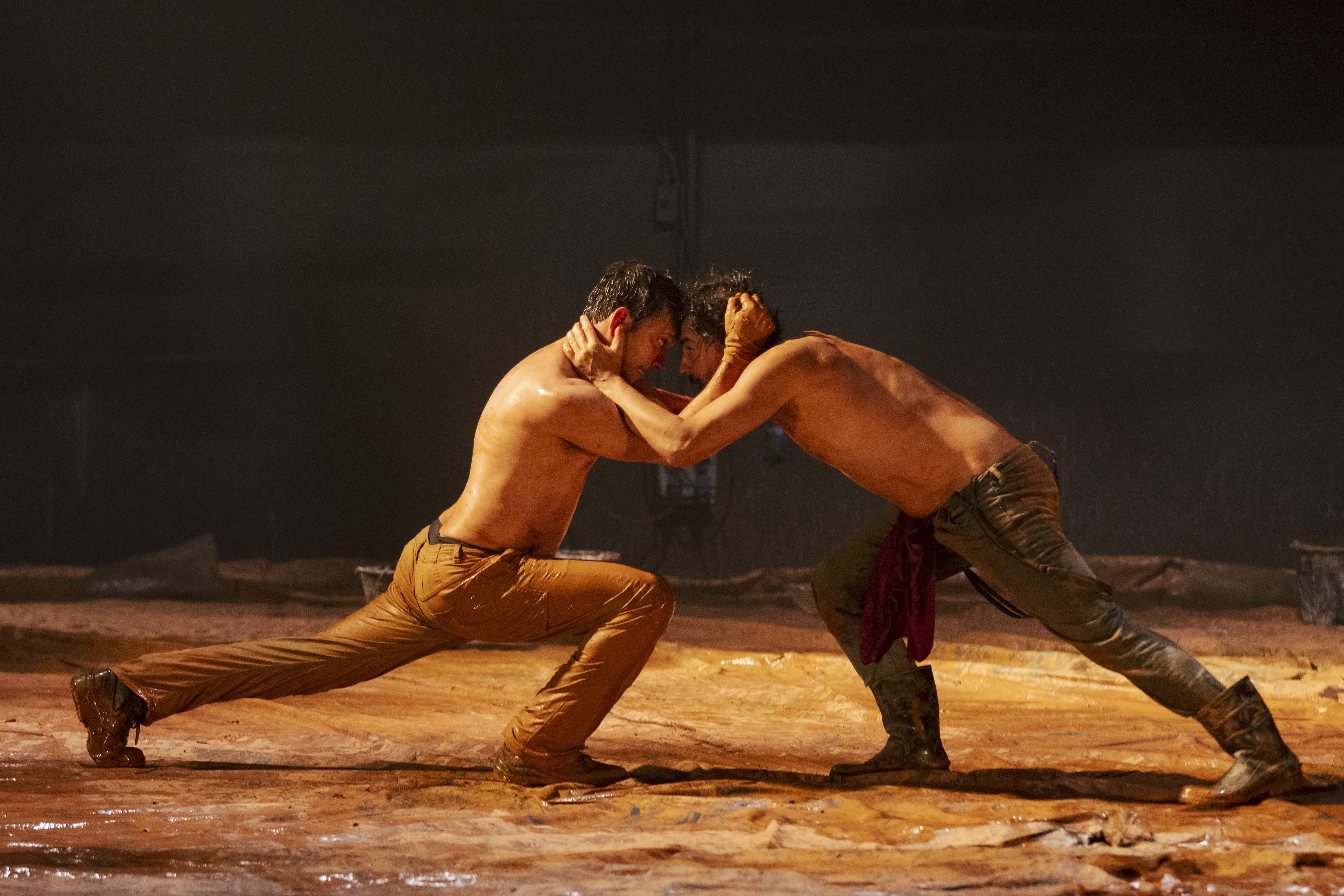 C’est une création aride, faite de boue, de chair, de sang, de sueur et de larmes. Sur ce plateau vide et boueux, s’affrontent deux hommes dans une relation charnelle, érotique, sadomasochiste, d’une violence et d’une sensualité enchaînées l’une à l’autre sans que rien ne puisse les défaire. Rodrigo Portella signe un huis-clos étouffant, incandescent, porté par quatre acteurs prodigieux. Les sentiments sont aussi âcres et rougeoyant que cette boue qui leur colle à la peau et les relie à la terre. Il y a, oui, quelque chose de tellurique et de primaire, dans sa brutalité nue et rêche où l’homme dans la haine sans compassion de l’autre et de la différence devient un animal, un loup pour le lièvre. L’homophobie dans sa monstruosité absolue explose ici dans toute sa barbarie. Francis torture Tom mais n’est-ce pas lui-même, dans la détestation de ce qu’il est, au nom des principes qu’il défend, qu’il broie ? Et Tom, qu’éprouve-t-il dans la soumission à ce traitement effroyable qui le voit malgré tout, un soir, demander à dormir avec Francis ? Lequel accepte et c’est un instant incongru et bouleversant de douceur… Etrange et perverse oscillation des sentiments que traduit chaque scène jouant de cette pendulation constante, bientôt affolée, maintenant le spectateur dans l’effroi de l’incertitude et de l’ignorance de ce qui peut advenir. Une scène magistrale et inattendue résume ça, cette danse, la cumbia si sensuelle qui voit ces deux-là s’enlacer et s’étreindre, où chaque caresse se mue bientôt en coups. Un corps à corps viril et sensuel comme une parade amoureuse et la promesse d’un acte sexuel et d’une jouissance qui se refuse où l’homme se cabre devant sa peur et ses contradictions. Et frappe. C’est d’une âpre beauté sans apprêt et, oui, c’est à pleurer. Cette tragédie est portée par l’interprétation incandescente d’Armando Babaioff et Gustavo Rodrigues qui transcendent chacun leur personnage et leur offre une vérité troublante, insondable, autant d’humanité blessée que de féroce bestialité. Démontrant que tout ça, par contamination, peut être dangereusement réversible. Quand le lièvre devient loup… Et d’avoir contextualisé et crée cette pièce au Brésil, pendant la mandature de Bolsonaro, pays qui détient le records de meurtres homophobes, où le patriarcat, la propriété et la religion excusent et autorisent en toute impunité toutes exactions envers les minorités ne donne que plus de poids à cette création qui nous cingle salement.
