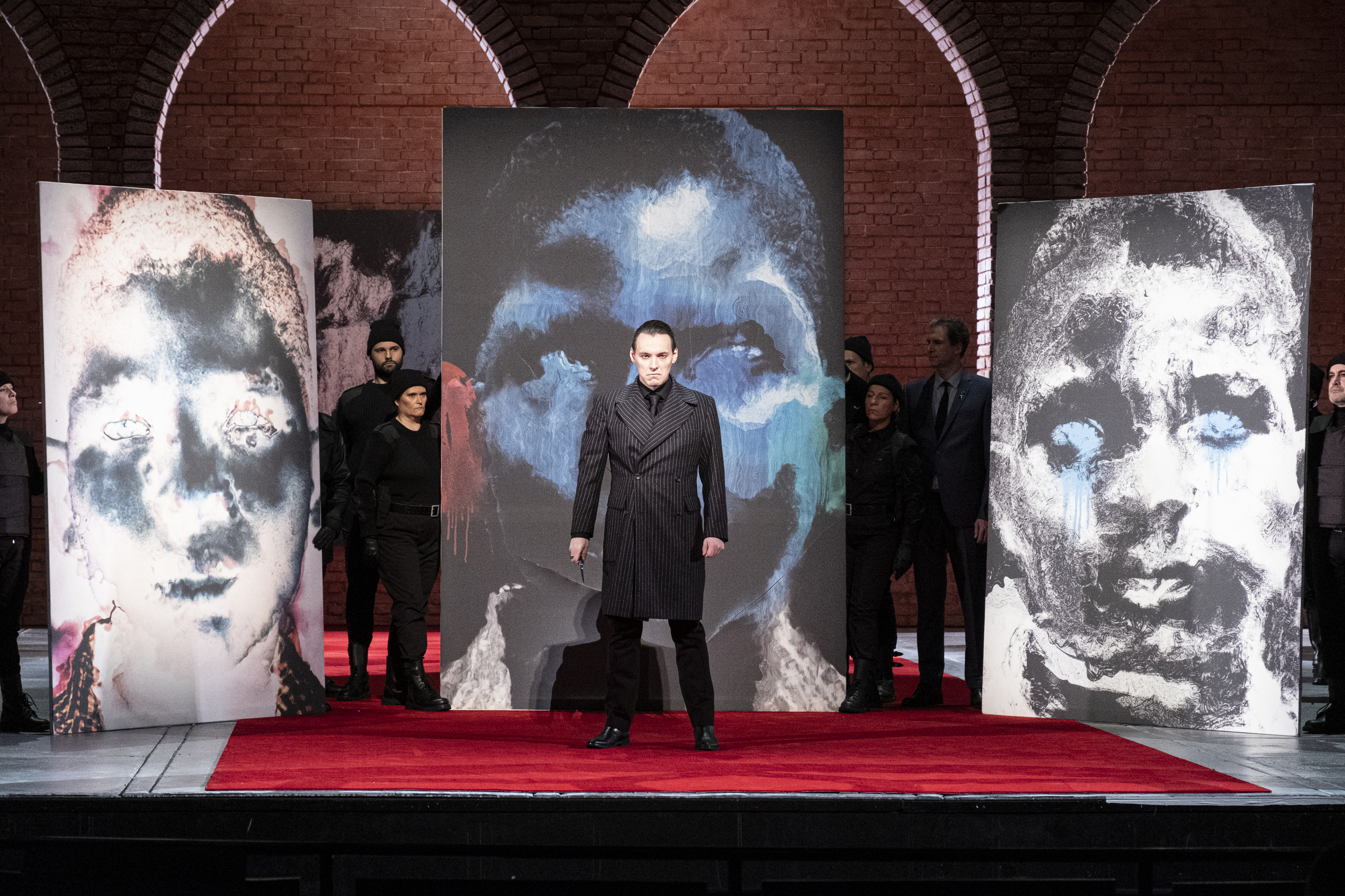 Et ce qui frappe c’est l’engagement des chanteurs dans ce projet, dirigés au cordeau. Leur appréhension de cette mise en scène à laquelle tous semblent adhérer sans réserve comme libérés des clichés et du carcan traditionnel afférent à l’œuvre. Comme toujours avec David Bobée le collectif importe. Et ce que l’on ressent immédiatement c’est bien cette cohésion sur le plateau. Latonia Moore, voix ample, souple et riche, incarne Tosca dans ses pleins et déliés avec un engagement total, tant vocal que physique. Incarnation d’une grande justesse, elle donne véritablement corps à Tosca, sans aucune réserve, jusqu’à la brûlure. C’est dans le second acte, la confrontation avec Scarpia, qu’elle donne toute la mesure de son talent, de la subtilité de son interprétation, de sa grande expressivité toute en nuance. Kostas Smoriginas, voix puissante et chaude campe un Scarpia hiératique, marmoréen, glacial. Un jeu intériorisé, voire minimaliste, évitant avec bonheur tout effet. Le parfait salaud et sans une once de vulgarité. Andréa Carè, Cavaradossi, n’exacerbe pas ses sentiments mais offre une grande douceur qui séduit. Avant de vous bouleverser au dernier acte. La distribution dans son ensemble, il faudrait tous les nommer, est de haute tenue. Le chœur Accentus encore une fois fait merveille. Et la direction musicale d’Eivind Guldberg-Jensen précise, attentive à toutes les nuances de la partition, joue sans lourdeur de la tension dramatique imposée à la fois par Puccini et David Bobée.