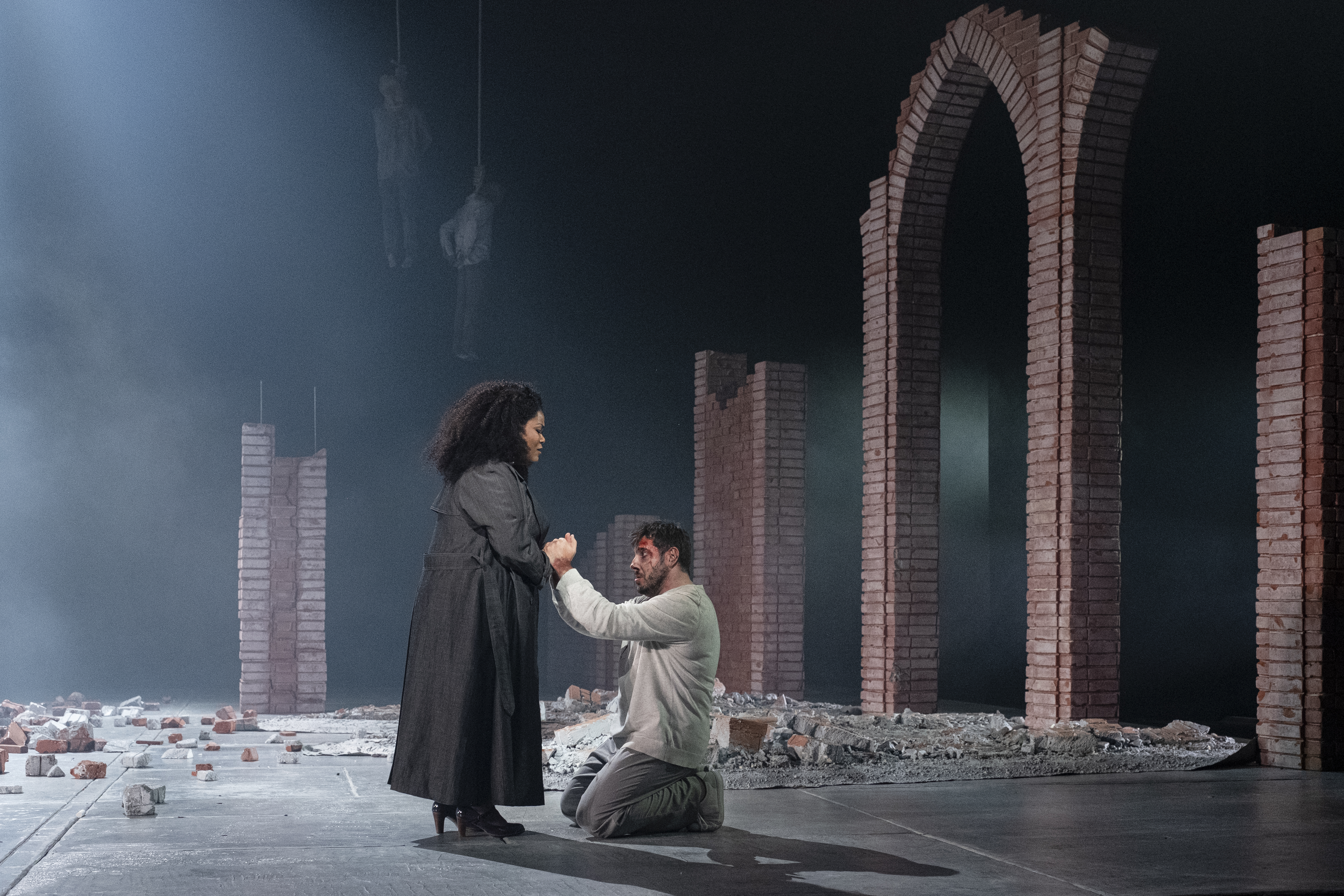 En s’attaquant à Tosca, objet de haine cynique plus que de désir réel, David Bobée souligne combien dans ce monde-là les valeurs sont inversés, c’est à l’art que Scarpia s’attaque, réduisant Tosca à un corps purement sexué, érotique, objet de plaisir et de jouissance pas même consentis, niant sciemment sa dimension artistique, la dépouillant de son chant. Appliquant en toute logique la culture du viol propre à tout régime tyrannique. Tosca réunit en elle tout ce qu’un pouvoir totalitaire abhorre, être artiste et femme, libre et résistante. En forçant Tosca c’est un pays qui est forcé, anéanti. Plus qu’avec Caravadossi elle est le point nodal autour duquel se cristallise l’aversion d’un régime autocratique et patriarcal représenté par Scarpia, pour toute forme de liberté et dont les femmes sont les premières victimes. Tosca, le corps de Tosca et sa destruction deviennent un enjeu politique. Une politique qui ne laisse derrière elle que ruine. Au troisième acte dans ce même décor du premier dont il ne reste plus rien, s’écroulant avec fracas devant nos yeux comme tombe toute espérance, Caravadossi est fusillé parmi les gravats de ce qui fut un lieu de culture, là où brûlèrent ses toiles… La boucle est bouclée. Mais les fusils sont également tournés vers la salle. Au travers de lui, c’est tout un peuple qui est menacé, c’est nous qui sommes mis en joue. Glaçant ! La mort de Tosca, magnifique idée, est plus une assomption qu’une chute, ultime épiphanie d’une résilience par-delà la mort. David Bobée signe une mise en scène dépouillée de tout apparat opératique. Se débarrasse de tout romantisme empesé, de toute référence historique pesante, pour une lecture radicale, universaliste plus que contemporaine. David Bobée interroge l’ouvrage, partant du livret, dans ce qu’il révèle de dysfonctionnement du politique livré à la barbarie d’un régime totalitaire, broyant les individus. Une mise en scène cohérente, sans esbroufe, sèche et souple comme un coup de trique qui vous cingle salement, où le discours engagé ne l’emporte jamais sur l’ensemble de l’ouvrage mais se nourrit de lui et de ses interprètes.