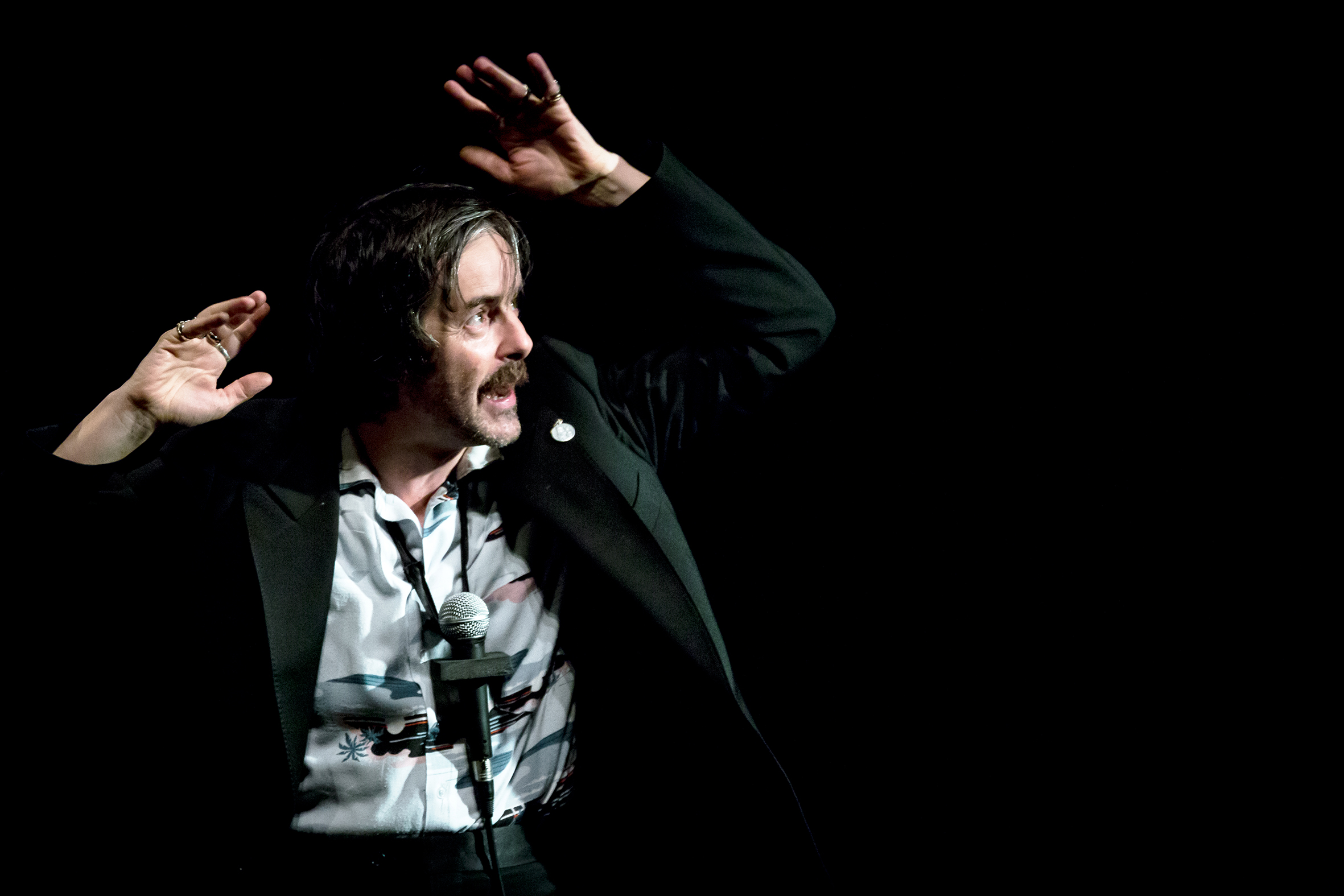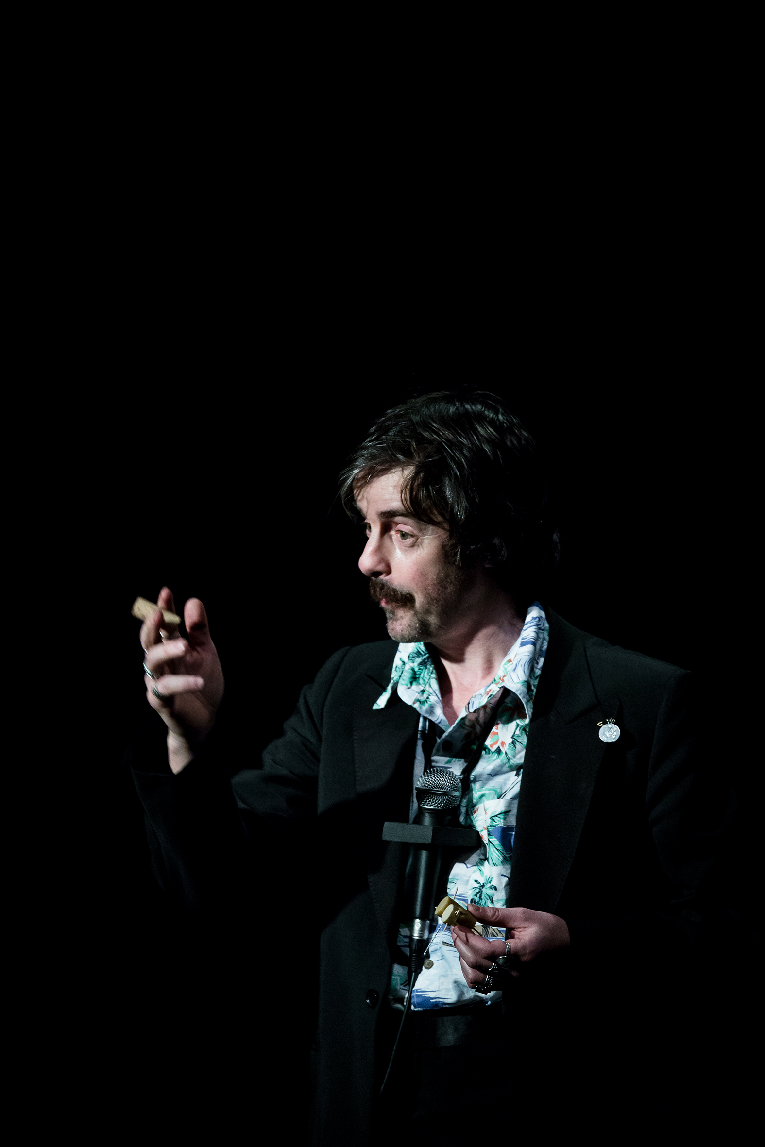 Tout Dostoïevski, ou presque. Presque, parce que dans ce presque se bousculent de formidables et merveilleuses digressions, entre considérations personnelles, vodka, et commentaires sur l’œuvre et l’auteur. Inévitablement en une heure, le pari est tout simplement impossible. Mais qu’importe, Charles Courtois Pasteur, étrange personnage entre le bateleur de marché avec son micro en sautoir et le conteur – formidable – plus connu sous le nom de Charlie, avatar d’Emmanuel Vérité, nous embarque quasi illico dans l’œuvre, rend hommage à un monument de la littérature russe qu’il visite de façon unique, tout à la fois notre guide et acteur. Oh, avec pas grand-chose, quelques anecdotes, quelques bouchons sculptés, c’est sa passion du moment, et des références surprenantes et d’une évidence qu’on se prend à se dire pourquoi n’y avons-nous pas pensé avant. Prenons Colombo, l’inspecteur à l’inusable usé imper mastic, au cigare mâchouillé. Comparons-le à Porphiri Petrovich, l’enquêteur chargé de l’enquête du meurtre de l’usurière par Raskolnikov. Eh bien Crime et Châtiment c’est la même chose, le même principe qu’un des très nombreux épisodes de cette série policière. Tout y est. On connaît l’assassin, on attend juste qu’il tombe dans les rets d’un inspecteur retors que l’on ne soupçonnerait pas d’une once d’intelligence. Voilà et si après ça, résumé comme ça, on ne se précipite pas dans le roman, c’est à n’y rien comprendre. Charlie aura raté son pari. Lequel n’hésite pas à reconstituer la scène du crime, un vrai polar on vous dit, hache en main et spectatrice sacrifiée sur le plateau, pour un court instant usurière et victime. Alors c’est vrai Dostoïevski fait peur, Charlie en convient. D’ailleurs il met l’ambiance d’emblée, deux chandelles magiques et quelques fumigènes, voilà pour l’atmosphère. Et c’est beaucoup de pages, des noms et surnoms impossibles, des intrigues tortueuses, des crimes, des parricides, de la méchanceté, des remords, de la culpabilité, de la folie. La Russie moderne et la métaphysique, le libre arbitre, Dieu et tout ça… Mais cette peur, un peu plus d’une heure plus tard, s’est métamorphosé, magique Charlie, en un sentiment de bonheur de soudain comprendre ou redécouvrir une œuvre tout à la fois terrifiante et bouleversante. Pas pour rien que commençant par Crime et Châtiment – déjà le titre aurait dû nous mettre la puce à l’oreille – il termine en majesté et avec intelligence par Les frères Karamazov. Très utile là les petits bouchons pour ne pas se perdre dans la fratrie. Juste la fin du roman, qu’il raconte, l’enterrement du petit Illouchia et l’allocution d’Alexeï, le petit dernier des quatre, près de la pierre. Et là Charlie devient un conteur magnifique. Qui vous donne le frisson et vous prend à revers avec une simplicité, sans effet aucun, rien d’autre que la lumière qui décline. Ah ! la belle farce, Charlie nous a bien eu qui nous la coupe net ! Et on se dit oui, rien que le choix de ses deux romans, pas de temps pour les autres et de toute façon inutile tant ces deux-là, emblématiques, éclairent sans doute l’ensemble de l’œuvre, c’est tout Dostoïevski qui vous tombe dessus, de tout son poids, sans crier gare. On devrait se méfier de Charlie, qui ne paye pas de mine c’est vrai, un peu comme Colombo, mais véritable auguste avec sa charge tragique et cette part d’humanité, la seule sans doute à pouvoir vous guider dans les méandres de cette œuvre monstre avec trois fois rien, quelques petits bouchons, un peu de vodka et une hache. Charlie, Dostoïevski même combat ? Imaginons Dostoïevski en chemise hawaïenne…