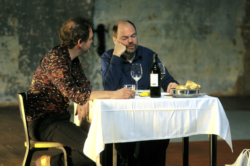 « Trahisons » de Pinter, histoire d’un adultère, d’une relation à trois bien plus trouble qu’il n’y parait. C’est d’une formidable perversion, d’une incroyable cruauté. C’est une dissection minutieuse, subtile de la nature humaine et des relations entre individus. Mais la structure dramatique particulière de « Trahisons » », le fait de commencer à rebours, partir de la fin et terminer par le début de cette histoire, trouble d’emblée notre regard. Rien n’est vraiment assuré. Pinter nous dupe avec une habilité diabolique. De scènes en scènes nous sommes amenés toujours à reconsidérer les liens qui unissent les trois personnages sans jamais vraiment être certain de la vérité exprimée. Un étrange effet de domino où chaque scène au regard de la précédente fait tomber nos fragiles certitudes. Comme les personnages, on avance ainsi de mensonges en soupçons, de soupçons en trahisons. C’est une mécanique de vaudeville sophistiquée et subtilement tordue. tg STAN s’empare de cela avec une évidente gourmandise, avec ce sourire en coin qui caractérise un des piliers de la compagnie, Frank Vercruyssen, ici le mari. Et comme toujours avec cette compagnie flamande on joue sans vraiment jouer tout en jouant. Là aussi c’est retors. Une impression (fausse) d’improvisation. Rien ne semble préexister. La pièce semble s’écrire sous nos yeux. Et s’inventer la scénographie. Entre silence, hésitation, emballement. Et avec Pinter ça marche du feu de dieu. Les acteurs raclent Pinter jusqu’à l’os. Lui apportent sans pincette une modernité brute et formidable de justesse. La langue de Pinter, directe et sans fard, économe, sied bien à cette formidable compagnie et à ce jeux si particulier qui peut au premier abord déstabiliser. L’acteur et la langue, dont ils font leur miel, sont le centre du plateau. Plateau vide. La scénographie est de l’ordre de « la citation ». Le lit, symbole de l’adultère, ironiquement est relégué au lointain cours du plateau, collé au mur et ne sert au final que de garde-robe à Emma. Une table et deux chaises suffisent bien pour voyager de Venise à Londres. Et ça et là quelques trouvailles heureuses. Des livres – nous sommes chez un éditeur – empilés à l’avant-scène que l’on range à jardin, tome après tome, scène après scène, 9 en tout, comme autant de chapitres d’une vie passée que l’on clôt. On boit aussi, beaucoup. Classique bourgeois mais tous ces verres à moitié vides –ou pleins- qui s’entassent étrangement au fur et à mesure à l’avant-scène seront le décor de cette fête qui vit l’adultère démarrer. Mais cette vaisselle sale c’est aussi ce qui semble rester de cette histoire… Les fonds de verres sont toujours tristes et amers. Et les déplacements d’objets sont aussi l’occasion pour les personnages de se croiser et d’ajouter à leurs jeux. Le mari qui, plantant le décor où s’installent les amants, croise inévitablement sa femme et son meilleur ami, corse indirectement la situation certes mais ajoute aux non-dits qui rongent les personnages. Troublante ambiguïté de déterminer qui des comédiens ou des personnages à cet instant se croisent. Ah le petit sourire de Frank Vercruyssen à Jolente De Keersmaeker – à moins que cela ne soit celui de Robert à Emma – pendant qu’il installe chaises et tables… Car qui sait quoi ? Comme Jerry furieux d’apprendre que Robert n’ignorait rien de sa liaison… Il n’y a au final rien qui ne fasse obstacle entre le texte et le jeu. Et quel jeu… Jolente De Keersmaeker, Robby Cleiren et Frank Vercruysen forment un trio épatant qui vous dégraisse Pinter avec intelligence, subtilité et s’engouffrent dans le texte mais aussi les non-dits, les ambiguïtés fumeuses des personnages avec une gourmandise non feinte. Sans boursoufflure, sans en rajouter, fidèles au texte, c’est d’une simplicité et d’une efficacité redoutable. C’est rapide et net. Une ligne claire qui ne s’embarrasse pas de détails superflus. Et une distance qui sied bien ici et avec justesse à l’ironie mordante de Pinter. Car si tout ça, si fluide, semble si léger cela atteint au final une profondeur insoupçonnée.