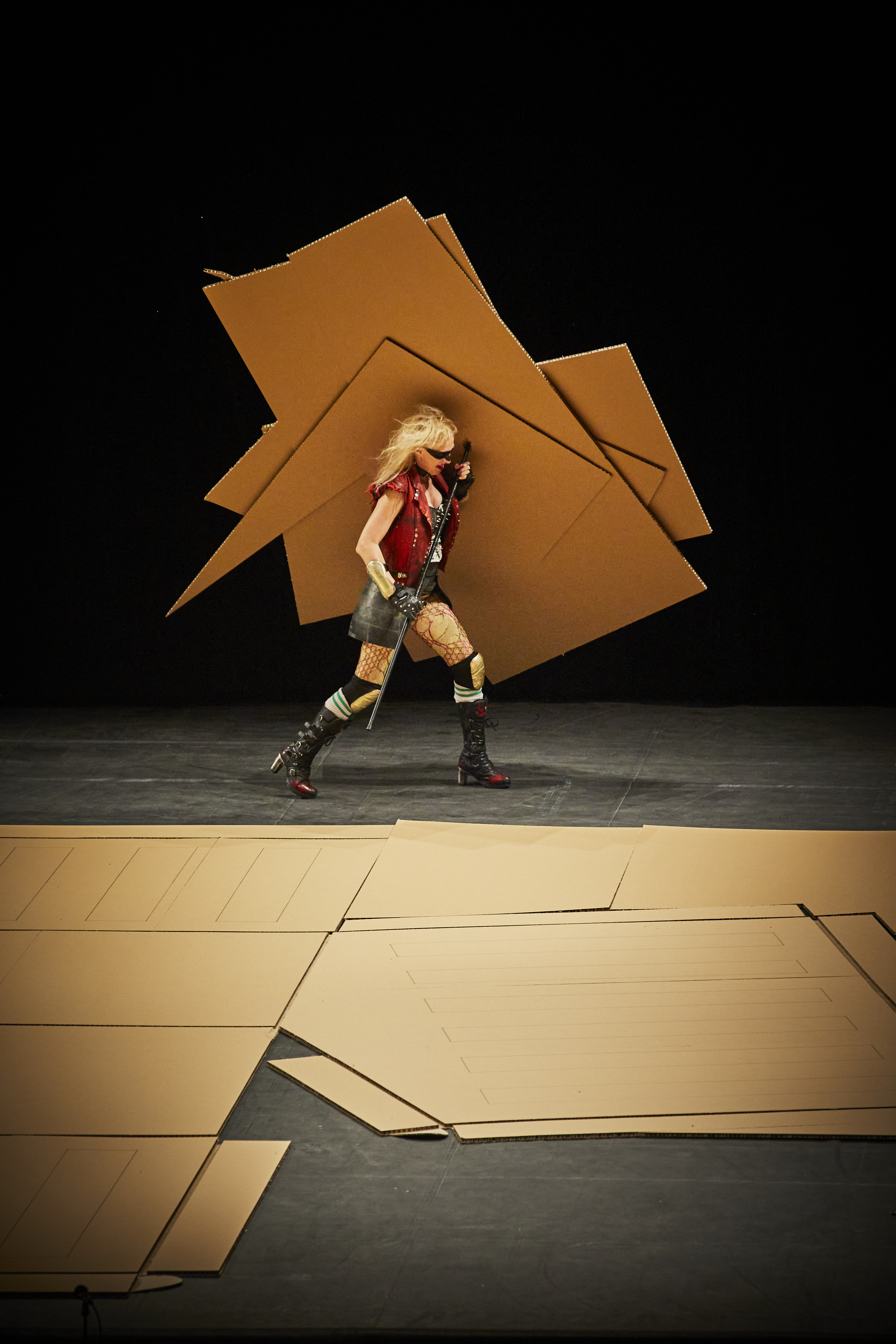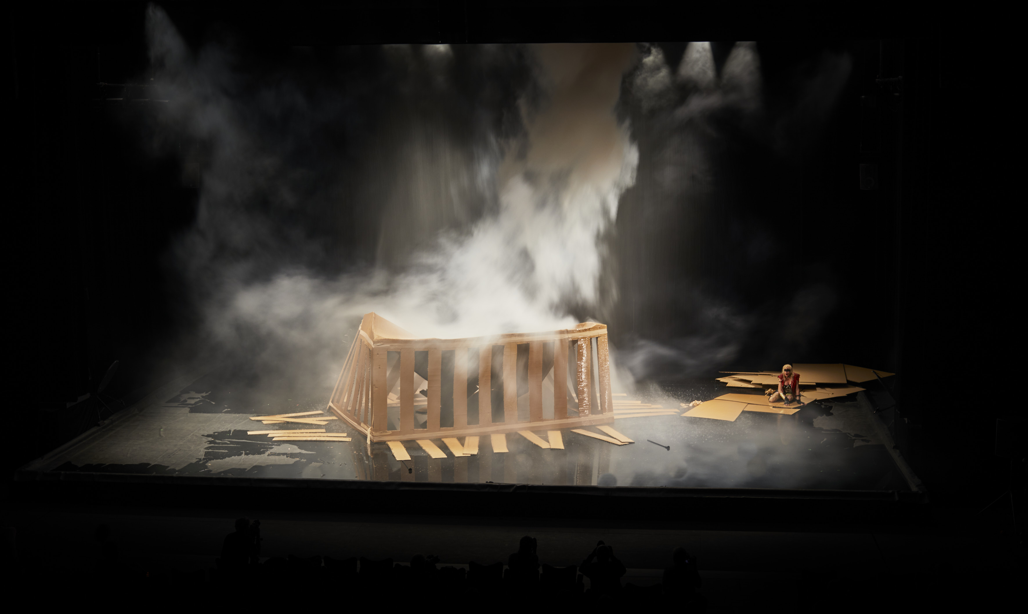 La Trilogie des Contes immoraux (pour Europe) démarre par la construction de la Maison Mère. Phia Ménard se relève du fond du plateau où elle était assise tout le temps que les spectateurs prenaient place dans la salle. Dans une démarche à la fois virile et chaloupée sur ses chaussures compensées et look (vêtements et maquillage) de super héroïne, Phia Ménard parcourt et s’empare au sens propre du plateau. Recouverte sur toute sa surface de plus de 400 m2 d’un immense carton prédécoupé, la scène sert de plan de travail à l’artiste qui consciencieusement découpe, plie, et une heure durant élève une structure souple d’abord informe, puis prenant peu à peu forme, à grand renfort de lances et de gros scotch marron. Une boîte ? Non. Une maison éphémère ? Presque. Un temple ? Oui. Un temple grec forcément, une fois que la tronçonneuse a découpé de l’intérieur les piliers. Un Parthénon en kit. Une heure d’effort, parfois vraiment physique, où le spectateur pouvant être dubitatif au début de l’entreprise se prend à s’émouvoir des difficultés de réalisation de cette œuvre improbable et qui semble parfois dominer sa créatrice, qui tel Sisyphe recommence sans jamais abandonner. Ce n’est pas sa volonté qui aura raison de l’entreprise, mais une extranéité qui la dépasse. En quelques minutes, ce qui n’est finalement qu’un décor de carton-pâte s’effondre sous un déluge implacable. D’abord le toit. Les parois résistent. On pense à Notre-Dame. Phia Ménard à terre nous regarde (pour la première fois) fixement sans prononcer un mot, nous rend témoins de son impuissance. Elle semble crier silencieusement, dans le vide. Personne ne vient la secourir. Le carton est évacué, tel un vulgaire déchet sans importance. La fumée envahit peu à peu le plateau et la salle. Une allégorie des effondrements économiques dus à l’ultralibéralisme, aux totalitarismes, à la corruption, au dérèglements climatiques ? Grèce, Brésil, Liban, Arctique ? L’embarras du choix. Chacun s’y retrouvera.