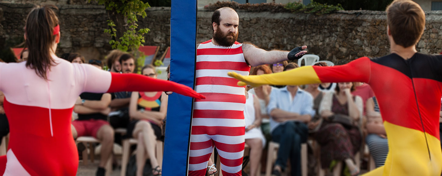 On ne sait quelle relation psych-anal-ytique Olivier Martin-Salvan entretient avec les cours d’E.P.S. – en fut-il dispensé, pour pouvoir lire, lui ? Nostalgie ou vengeance, c’est autour de tapis de sol qu’il nous convie à son Ubu. Non un Ubu roi, mais un Ubu sur la butte, explicitement destiné à des marionnettes par son concepteur Alfred Jarry. La butte, ce sera donc ces accessoires en plastique bleu que les quatre comédiens manient pendant une heure, les transformant en cheval, en épée, en château-fort. Les marionnettes, ce sont des acteurs revêtus de justaucorps aux couleurs et à la symbolique primaires, qui, comme il se doit, saluent en entrant sur le tapis, courent à petites foulées pour s’échauffer, halètent, se jettent à corps perdu(s) sur de mousseux monticules (comment veux-tu, comment veux-tu… ?). Sur scène, Véronique a bouffé Davina, c’est la mère Ubu, qui se promène avec sa perche à selfie ; les palotins sont idiots, la soldatesque débile, le tyran imbécile.