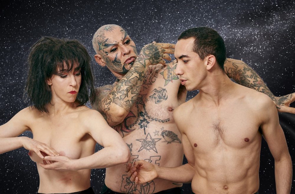 Après une brillante rétrospective de son œuvre protéiforme au Macval de Créteil, Jean-Luc Verna, dessinateur, performer, chanteur proposait à la Ménagerie de Verre pour le festival Etrange Cargo Uccello, Uccellaci & the Birds, proposition chorégraphique singulière, suite de tableaux vivants, retraçant en des poses académiques l’histoire de l’art et du rock , une histoire d’attitudes et de correspondances inconscientes ou non, avec en filagramme une histoire d’amour, traversée elle aussi de souvenirs de concerts rock et de musées, relayée par la voix de Béatrice Dalle sur un texte de Jean-Luc Verna. Les corps nus de Benjamin Bertrand et Loren Palmer sans autres apprêts qu’une perruque à la Siouxie pour la danseuse, comme une citation ou une référence explicite à l’une de ses muses avec Nina Hagen, rien pourtant de subversif. La subversion chez Jean-Luc Verna s’inscrit sur la peau de son corps tatoué et maquillé, histoire de sa vie, de ses vies. Le travail plastique de Jean-Luc Verna, lui, reste académique. Académique aussi comme sa métonymie, étude de nu d’après modèle vivant. Référence à la statuaire antique, à la peinture de la renaissance, vierges et dieux, héros mythologiques ou bibliques sont descendus de leur piédestal, de leur cadre et incarnés, sculptures vivantes, sous la lumière crue des néons, sur le béton du plateau de la Ménagerie de Verre. Dépouillés en quelque sorte de leurs décors, mis à nu. Les poses s’enchaînent donc, les références s’accumulent. Un dialogue s’amorce. Mais les correspondances entre attitude rock et histoire de l’art sont fragiles, ténues comme tout fruit du hasard. Jean-Luc Verna fait une apparition furtive et sage, presque timide. Son corps marqué, prenant lui aussi des poses, amène enfin une étrangeté, un paradoxe bien venu au regard de celui des deux danseurs absolument superbes. Etrange contraste se dit-on pour un acteur de la culture underground que de réaliser un travail aussi peu dérangeant voire terriblement classique. Peut- être que la subversion réside-t-elle là ? L’irruption d’un groupe accessoirisé sado-maso et fétichiste, danseurs professionnels ou amateurs, on y reconnaît François Sagat, star du porno gay sous une perruque blonde, casse la pesanteur qui menaçait cette création. Mais cette sarabande un peu folle, ce sabbat qui reprend en échos malingre et foutraque l’ensemble cette création avant de la conclure n’apporte au final pas grand-chose. La maîtrise et la tension qui prévalaient jusque-là s’effondrent avec ce final peu maîtrisé, trop hâtif, qui aurait pu être subversif et provoquer la curiosité, avec ces corps non conformes aux canons classiques, tatoués, percés, maquillés déboulant sur le plateau et prenant la pose à leur tour, détournant de façon ludique les codes académiques. Peut-être aurait-il fallu se concentrer davantage sur eux pour que la corrélation entre l’univers du rock et un certain académisme prenne pleinement tout son sens. Une création attachante, fragile mais qui ne tient pas toutes ses promesses.