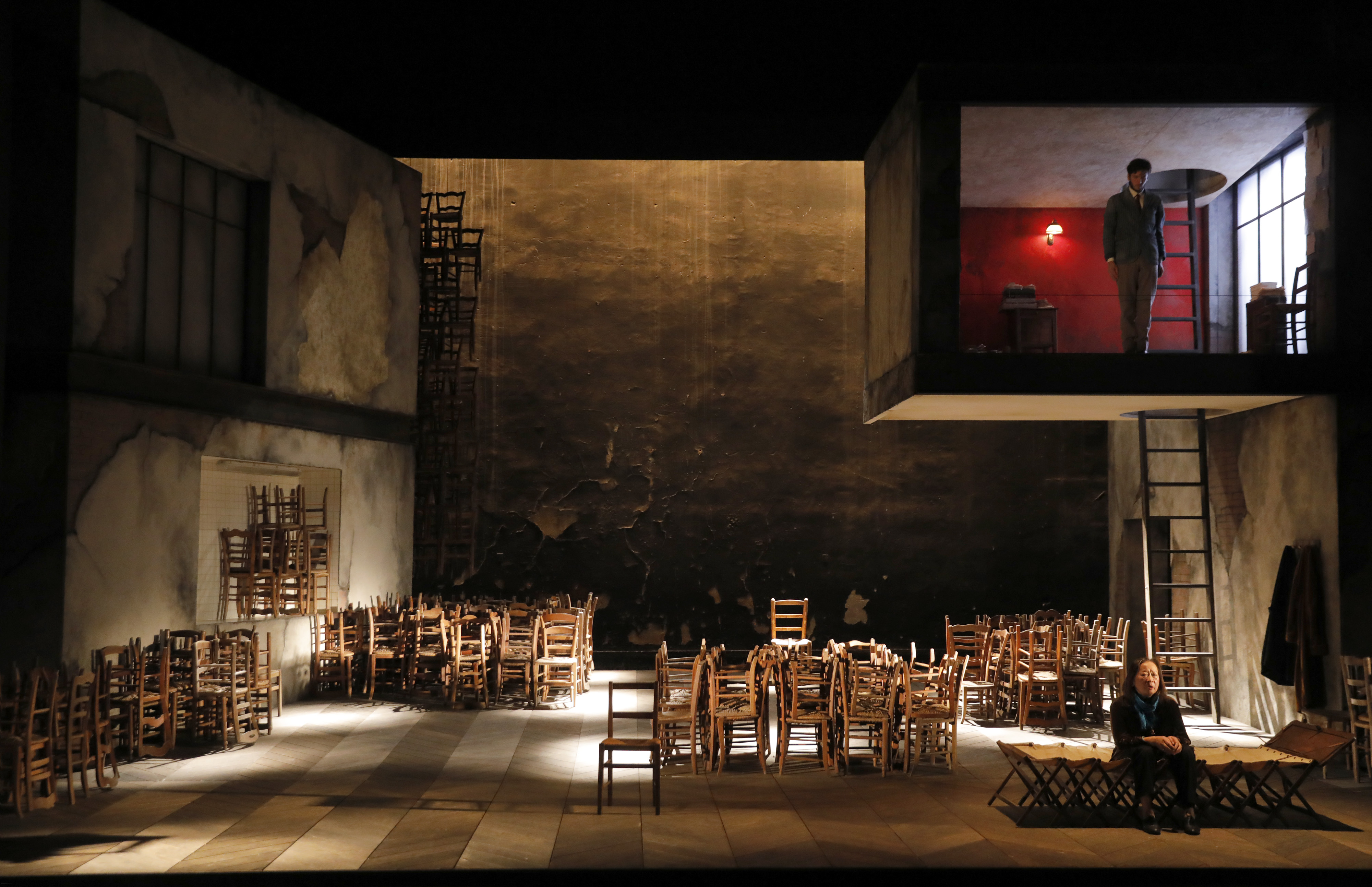 Au plateau trois espaces bien distincts sont présentés, un avant-plateau où les personnages sont invités à se souvenir de leur enfance, une pièce en suspension emplie de papiers représentant la chambre dans laquelle Proust s’est enfermé pour écrire et enfin le plateau empli d’un grand nombre (une centaine) de chaises en bois et paille évoquant ces espaces vides dans notre être, notre mémoire, laissés par nos êtres chers disparus ainsi que nos souvenirs oubliés. Les acteurs, tournent autour, remontent, traversent le plateau devenu mémoire justement. Un plateau si imposant qu’il empêche parfois  les sensations d’affleurer chez le spectateur en étant l’opposé exact de la volonté d’intimité recherchée par le metteur en scène.