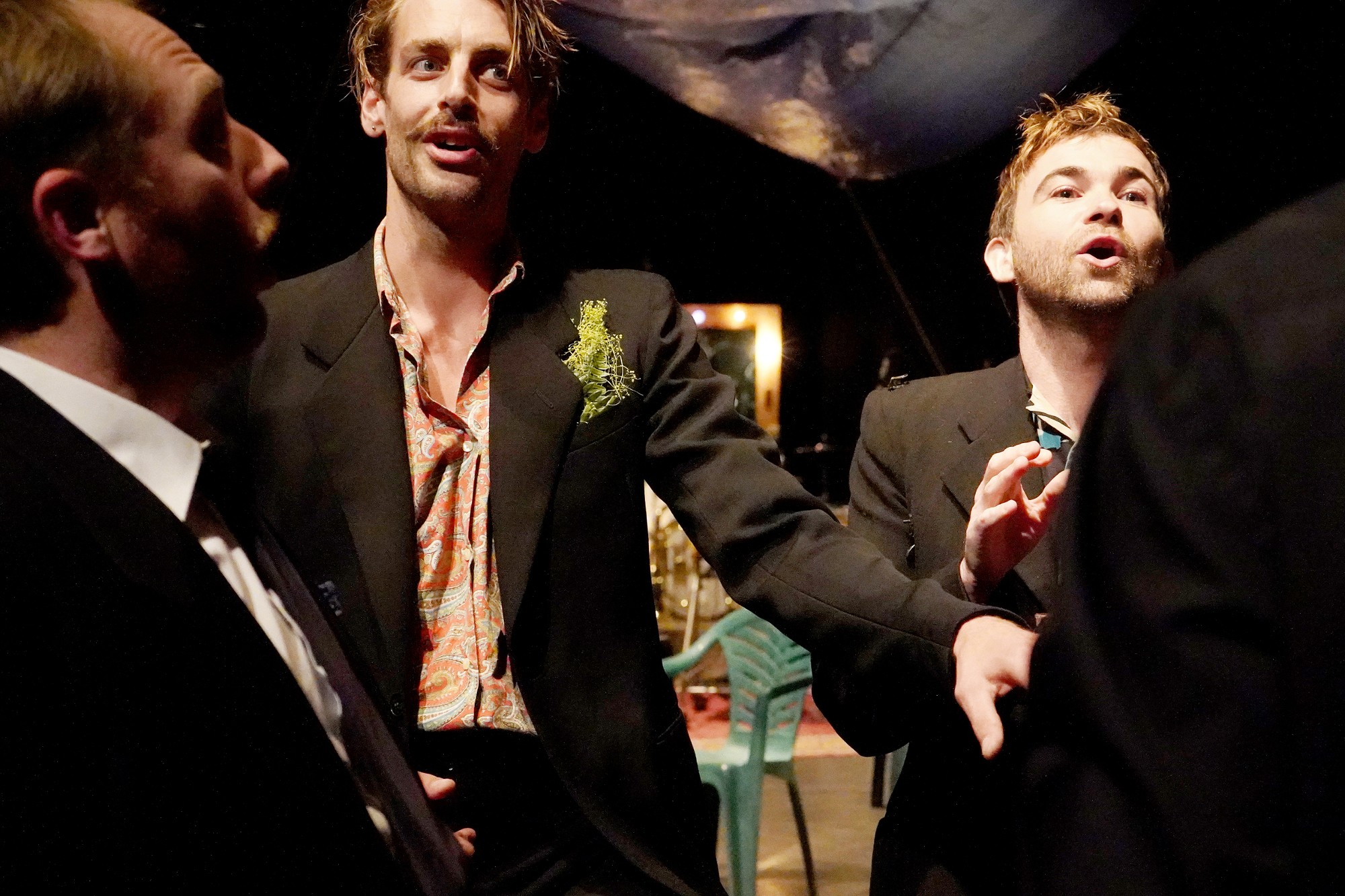 Cette cérémonie, c’est une foire d’empoigne, une kermesse pas même héroïque, une fin de banquet où l’on chante le malheur des hommes et d’un monde en faillite. On rit, on pleure, on gueule. On se castagne comme on s’embrasse, et les chaises volent en escadrille. On y porte des toasts, à tout, à rien et la mirabelle se siffle cul sec. Ils s’appellent tous Francis, ou Francine, se prennent pour Don Quichotte, ou bien Hamlet. Rejouent et revisitent Antigone, aussi, version tragi-comique. Car au vu de la situation, il vaut mieux en rire qu’en pleurer. On refait le monde comme on refait le match. Et l’on se tait, la conversation épuisée, le temps d’un battement d’aile de Ptérodactyle. On se pare d’étranges chapeaux, couvre-chefs de chaman à convoquer des esprits aux abonnés absents, attributs magiques et dérisoires pour appréhender un monde devenu incompréhensible. On fait appel à la chouette d’Athéna, ne sortant qu’à la nuit, pour grappiller un peu de sagesse, croit-on. Et on se fait un bœuf d’enfer pour dire le bonheur d’être ensemble malgré tout. C’est terriblement drôle et terriblement désespéré, grinçant comme du gravier sous les dents et qui agace les gencives. Inventaire poétique et caustique, terriblement lucide, sur notre monde brutalisé par la violence d’un ultra-libéralisme décomplexé, cette cérémonie est un rituel d’exorcisme, vain sans doute devant notre impuissance. Mais qui ne tente rien, n’a rien et le Raoul Collectif n’a pas peur des moulins et des vents contraires. Et sous le foutoir et le bordel apparent, c’est bien plus malin qu’il n’y parait. Ce qu’ils font là sur le plateau c’est tenter de redonner du sens à tout ça qui nous broie et de résister malgré tout à la pensée unique et sectaire. C’est sans doute bravache mais le théâtre est bien ce lieu cérémoniel de toujours où s’organise la résistance et le politique. Alors aux tables de cette cérémonie quelque peu funèbre qui suit nos illusions enterrées bien profond sont convoqués Homère, Sophocle, Shakespeare, Brecht… discrets convives mais comme autant de petits cailloux dans les chaussures, références obligées, résistants de la première heure, passés ici à la question. Et Cervantès, parce que sans imaginaire point de résistance ni d’utopie. Alors oui, la forme de cette création peut surprendre par son côté foutraque, son énergie débordante, son trop plein, mais elle est comme cette interrogation poétique teintée de gravité sur le monde et sa représentation. Ça part dans tous les sens, ça se frite, ça se réconcilie, mais c’est une réalité incontournable et c’est le monde comme il va, à la va-comme-je-te-pousse, un brin chaotique, absurde dans sa logique néolibérale et suicidaire. Surtout le chaos ici n’est qu’apparent tant la pensée qui le soutient, pas si brumeuse que ça malgré la mirabelle, est un exercice de rigueur implacable et d’une justesse imparable. Et jamais ce collectif ne perd le spectateur, mieux même il l’embarque fissa, invité lui aussi au bout de la table, à trinquer bientôt à tout, à rien, à faire silence entre deux battements d’aile de Ptérodactyle.
