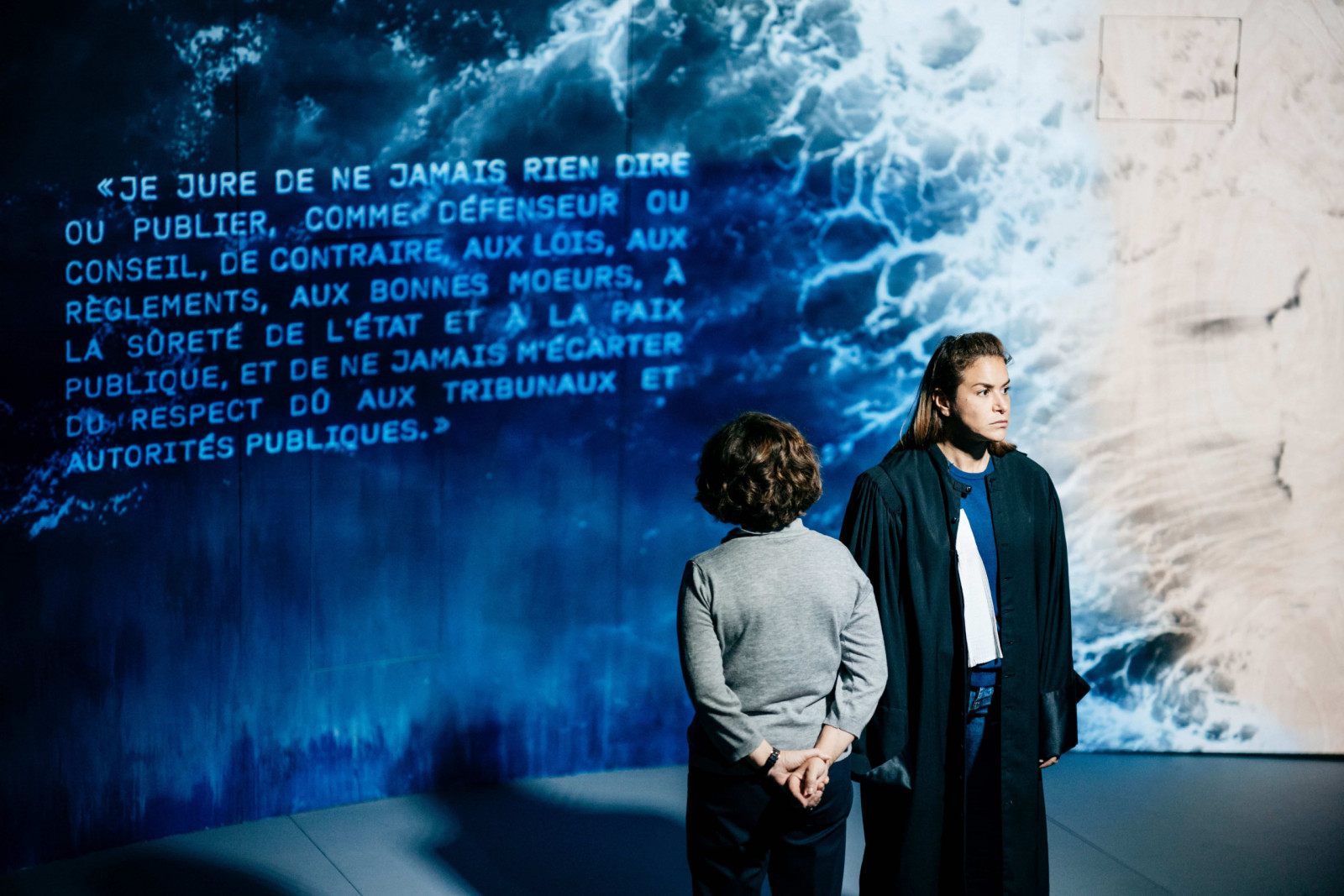 Le choix de faire porter par deux comédiennes, d’âges différents, sans les cloisonner pour autant dans deux périodes chronologiquement étanches, s’avère extrêmement réussi. Les deux voix différentes, aux sens propre et figuré, s’entremêlent. Les hésitations ou trébuchements sur certains mots ou phrases sont tout sauf problématiques et donnent un naturel bienvenu à la parole de cette femme extraordinaire, si bien que l’on se demande même si cela n’est pas voulu. Les déplacements calculés, allant du plateau aux premiers rangs dans le public, tout comme en haut des gradins, soulignent ce quasi don d’ubiquité de Gisèle Halimi, et cette volonté tenace de convaincre et de « changer le monde. » Alors qu’il s’agit formellement d’un monologue à la première personne du singulier, les deux comédiennes se succèdent ou se répondent comme dans un dialogue, voire même un trilogue du fait de la présence d’une troisième Gisèle, la vraie, à travers des extraits audio de plusieurs interviews qui rythment la pièce par quelques courtes incises et qui sonnent comme des formules inspiratrices pour toute femme quel que soit son âge (« que ma vie m’appartienne » ; « ne pas s’habituer »…) ou étape de sa vie. Les choix scénographiques accompagnent d’abord discrètement le jeu des comédiennes, la projection sur le mur du fond de mots, de textes (le serment par exemple, ou encore les noms des « 343 salopes »), mais aussi de personnages dessinés (dans un graphisme différent de celui de l’ouvrage illustré précité) n’est pas original mais efficace. Seules les lumières pourraient sans doute utilement être retravaillés (notamment pendant la plaidoirie d’Aix-en-Provence en 1978 dans l’affaire des deux jeunes femmes belges violées).