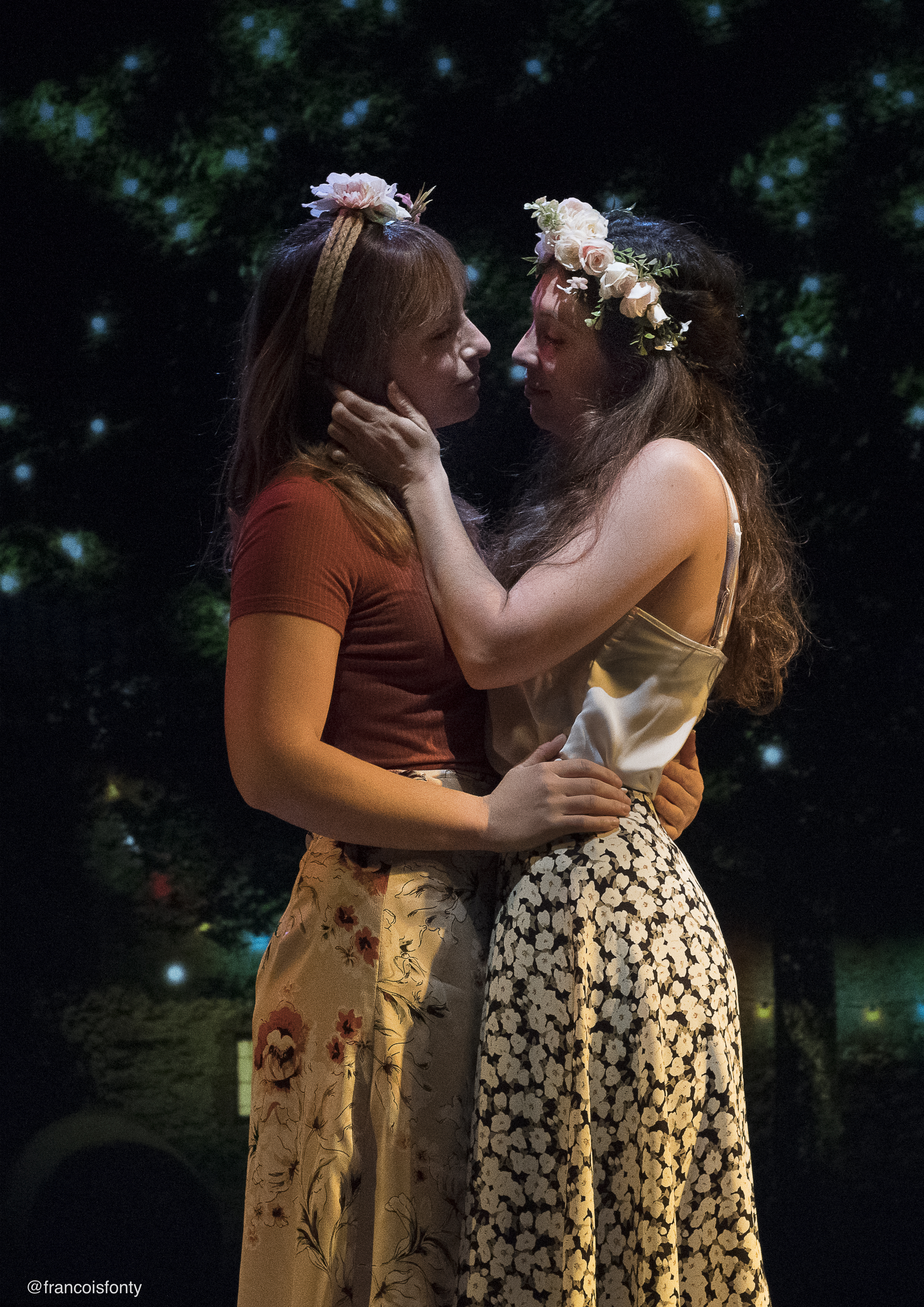 Le charme opère également grâce à la distribution, presque exclusivement féminine puisqu’Alexis Michalik joue le seul rôle d’homme (William l’écrivain). Il est drôle, séduisant même quand il est exaspérant d’égocentrisme. Katia, l’écorchée vive quand elle rencontre Juliette, est incarnée avec beaucoup de justesse par Juliette Delacroix, meurtrie mais combattante et aimante avec sa fille douze ans plus tard. Marie-Camille Soyer est si crédible dans le rôle enjoué de Juliette, traduisant sa pulsion de vie débordante et sa légèreté qui ne sont qu’apparence. La culpabilité l’a rongée pendant toutes ces années, mais elle reconnaît sans honte qu’« on fait tous des promesses qu’on n’arrive pas à tenir. » Enfin, Jeanne qui à douze ans lit entre autres La Critique de la raison pure de Kant, donne envie à tout le public de l’adopter, incarnée si sensiblement par Amélia Lacquemant (qui joue le rôle en alternance avec d’autres jeunes comédiennes). Il n’y que le rôle de Claire qui ne convainc pas totalement, alors même que la présence de Pauline Bression est incontestablement lumineuse, utilisant son sourire irrésistible dans le rôle le moins réaliste de la pièce. La récurrence de ses apparitions dansées casse le rythme (ce qui en soi pouvait être une bonne idée) et n’apporte rien. C’est dommage.